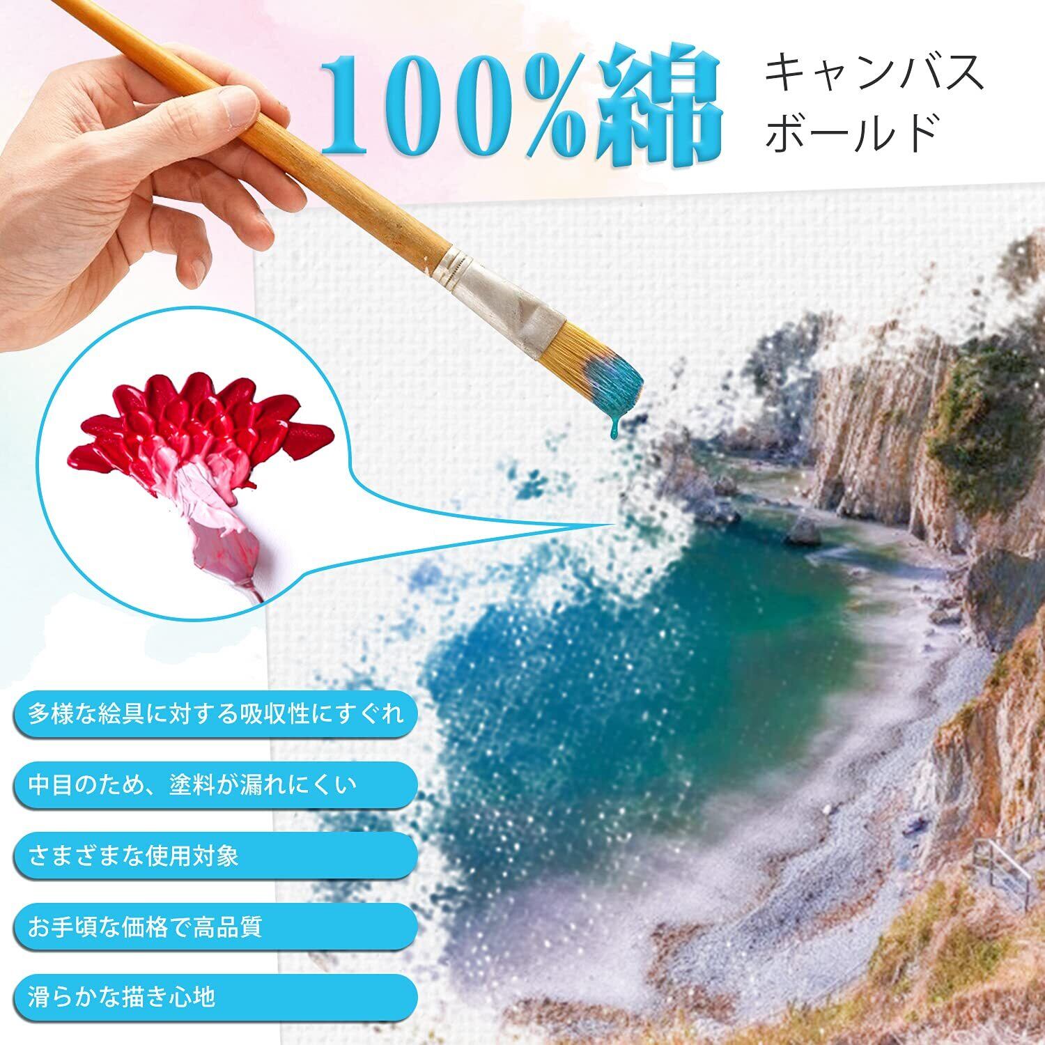 『ピュアコットン』アクリル、油彩共用タイプのキャンバスボードは無酸性アクリルジェッソで下塗り済みの画布を使って、目が均一で滑らかな手触りを持ち、色乗りがよく、描きやすいです。キャンバス布に三重のアクリル系樹脂塗料で下地処理を施して、表面に色を保持し、背面からの浸透を防ぎます。