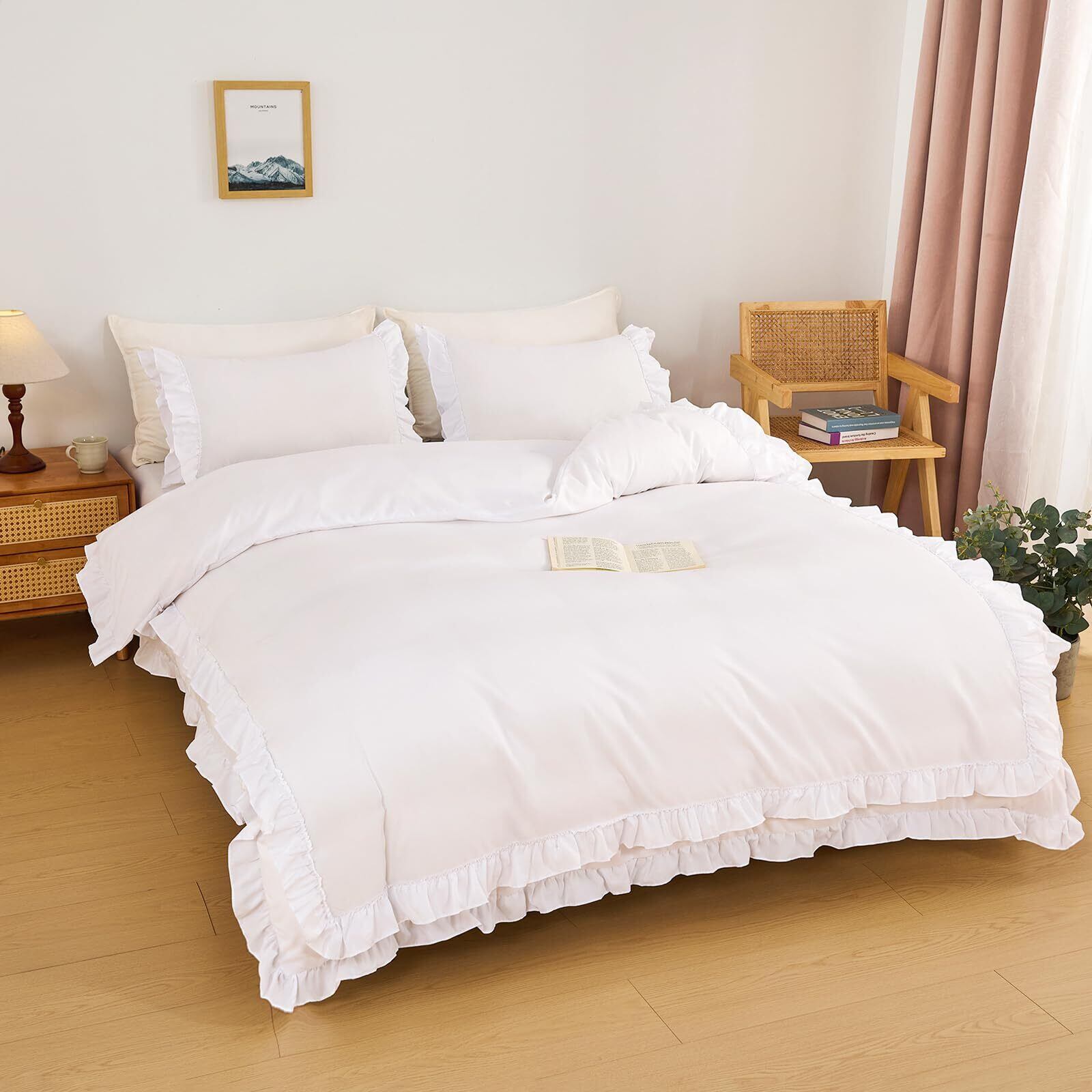 HOdo Home 布団カバー セミダブル 4点セット 掛け布団カバー ベッドカバー 枕カバー ベッドシーツ ボックスシーツ 洋式・和式兼用 寝具カバーセット フリル付き ピーチスキン加工 姫系 洗い替え速乾(ホワイト)