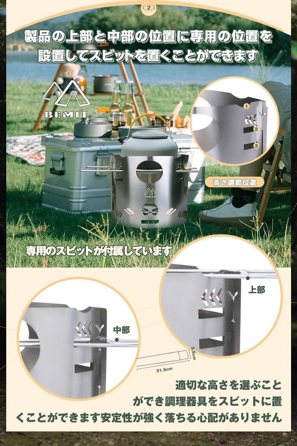 【専用のスビットが付属しています】サイズ:31.5CM×5.5CM。ミニ 薪ストーブの上部と中部の位置に専用の位置を設置してスビットを置くことができます。適切な高さを選ぶことができ、調理器具をスビットに置くことができます。安定性が強く、落ちる心配がありません。