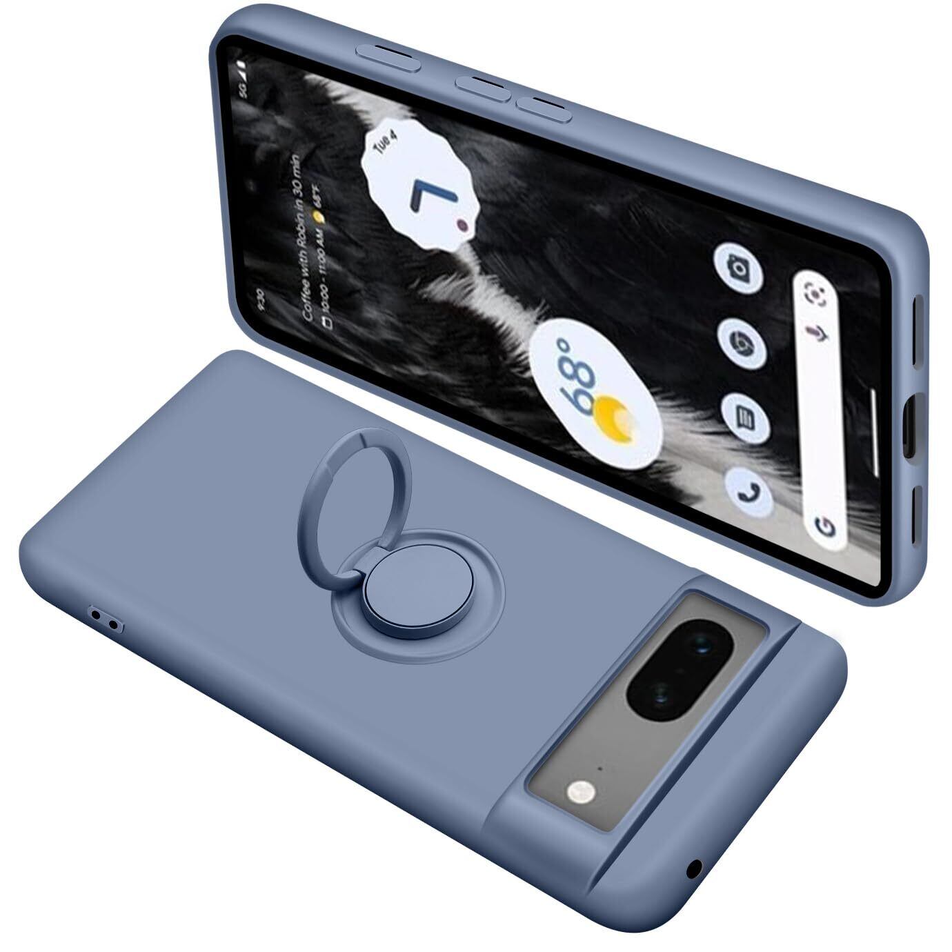 Google Pixel7 ケース リング付き シリコン 耐衝撃 グーグル ピクセル 7 リング カバー 液体シリコーン スマホケース 360°回転 スタンド機能 車載ホルダー ストラップホール付き 滑り止め 落下防止(グレーブルー)
