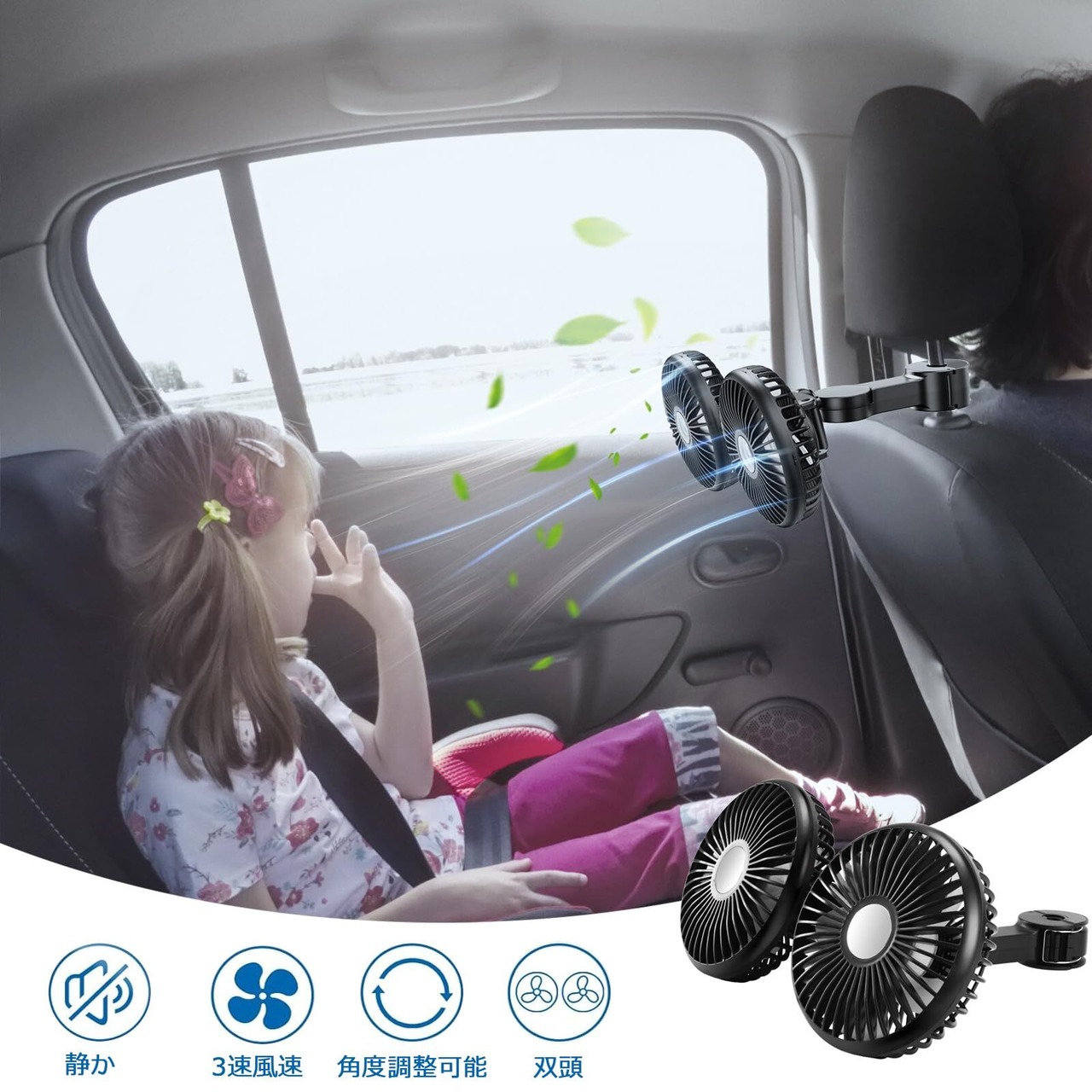 nediea 車 扇風機 車用扇風機USB 扇風機 後部座席の使用10W 5V/2A 双頭車載ファン 360°回転 角度調節可能 3段階風量調節 約180CM USB延長コード 低騒音 空気循環 蒸れ解消 取付簡単 夏対策 車中泊対策 カー用品