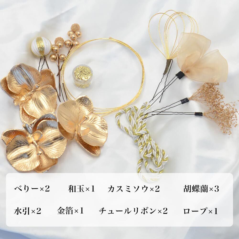 【可愛らしい大きめ胡蝶蘭】 純色な大きめ胡蝶蘭を中心に存在感バッチリのセットです。チュールリボン、かすみ草、アンティークベリー、水引、金箔などを加え、上品な優雅感だけじゃない可愛らしさもたっぷり。個別に使用することが可能で、お気に入りのスタイルを楽しく試してください。