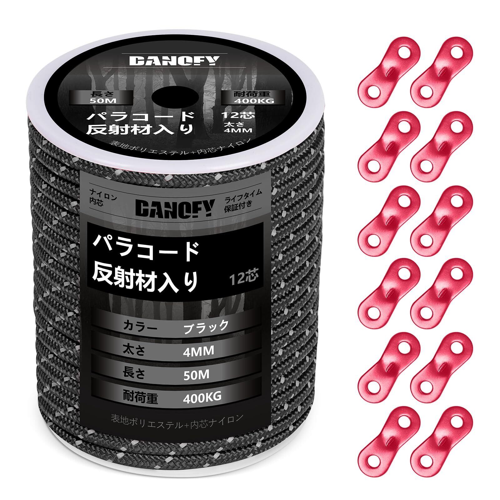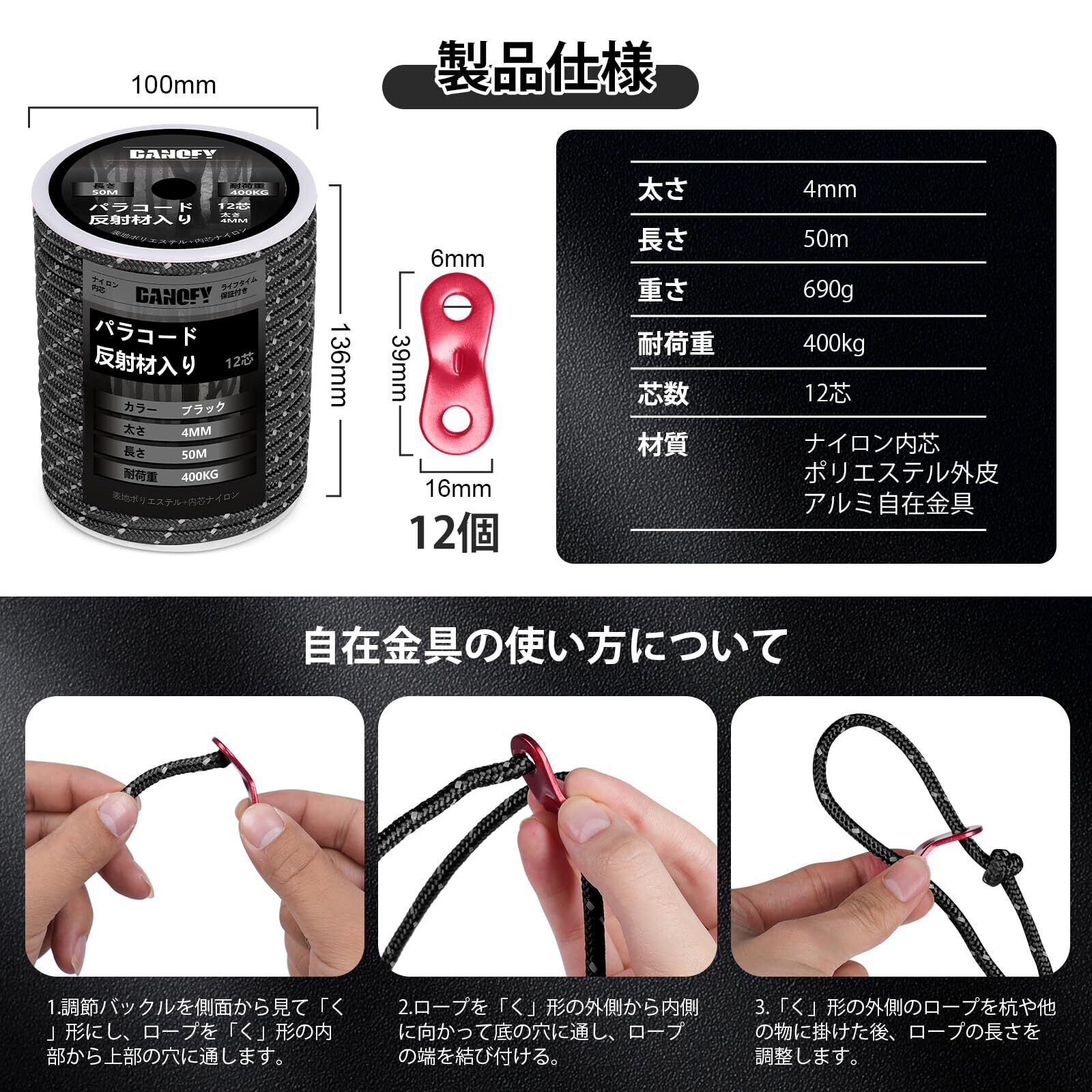 パラコード ガイロープ 4mm 反射 テントロープ - 耐荷重400kg 12芯 30m巻 自在金具付き ガイドロープ 細引き キャンプ タープ アウトドア アクセサリー用 紐 黒 DANOFY