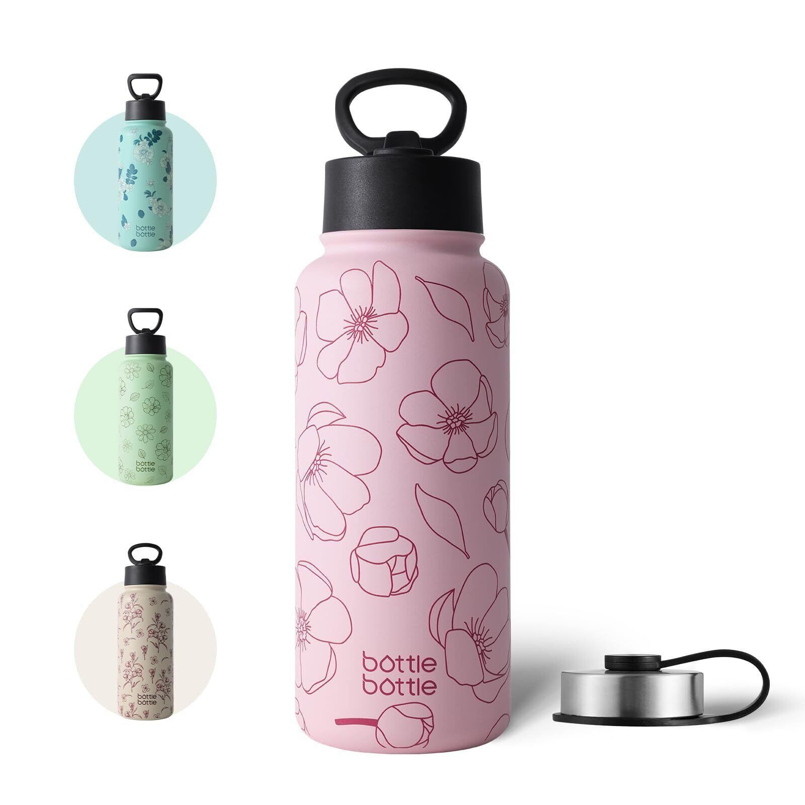 BOTTLE BOTTLE 水筒 1リットル ステンレス ウォーターボトル 直飲み ストロー付き 保温保冷 二重構造 真空断熱 持ち運び アウトドア ピンクフラワー
