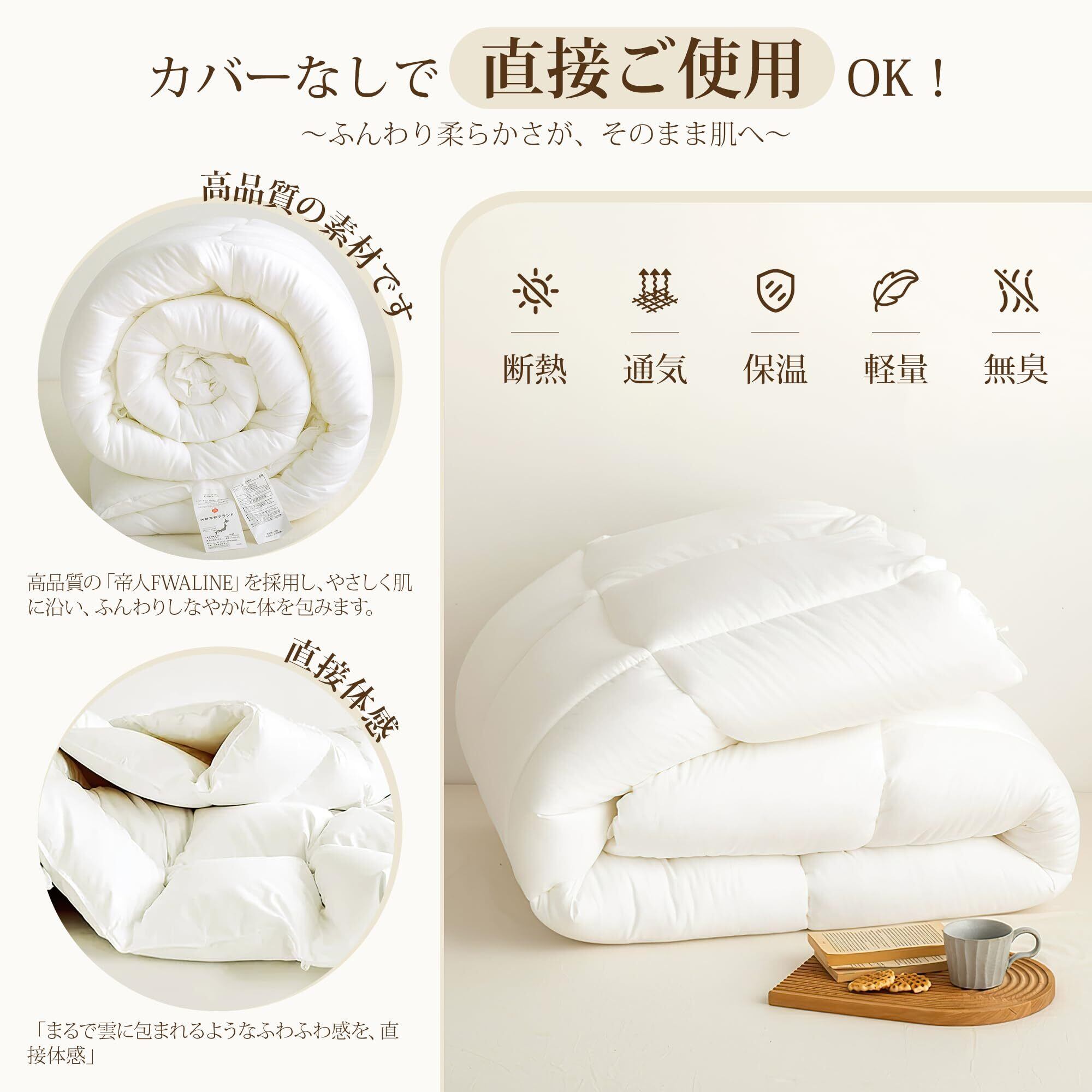 【90%ダウン相当・羽毛以上の通気性&保温性】天然羽毛の構造を再現した「人工羽毛」採用で、90%ダウン布団に匹敵する保温力。特殊な繊維構造が空気をたっぷり含み、羽毛布団より通気性・調湿性に優れ、暑すぎず寒すぎない快適な睡眠を実現。春秋はもちろん、夏の冷房対策や冬の保温にも最適です。