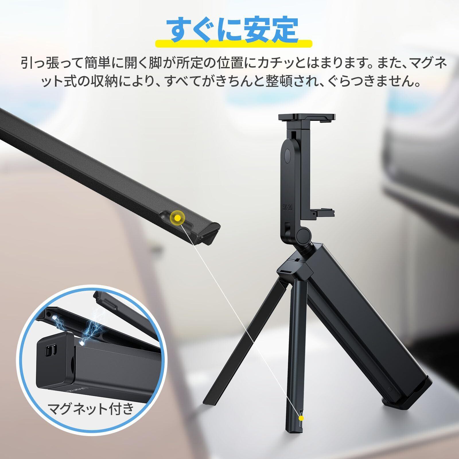 【三脚、自撮り棒&磁気で収納】挟むモードを使用しないと、側に隠れる二つ本のレッグを展開しても、簡易なスマホ三脚になります。引っ張って脚が単に所定の位置にカチッとはまり、倒れる心配がありません。また、マグネットでピタッと収納でき、ぐらつきません。スマホグリップ幅は約5.5~9cmで、4~7インチのandroidスマホとiPhoneほとんどのスマホに対応します。