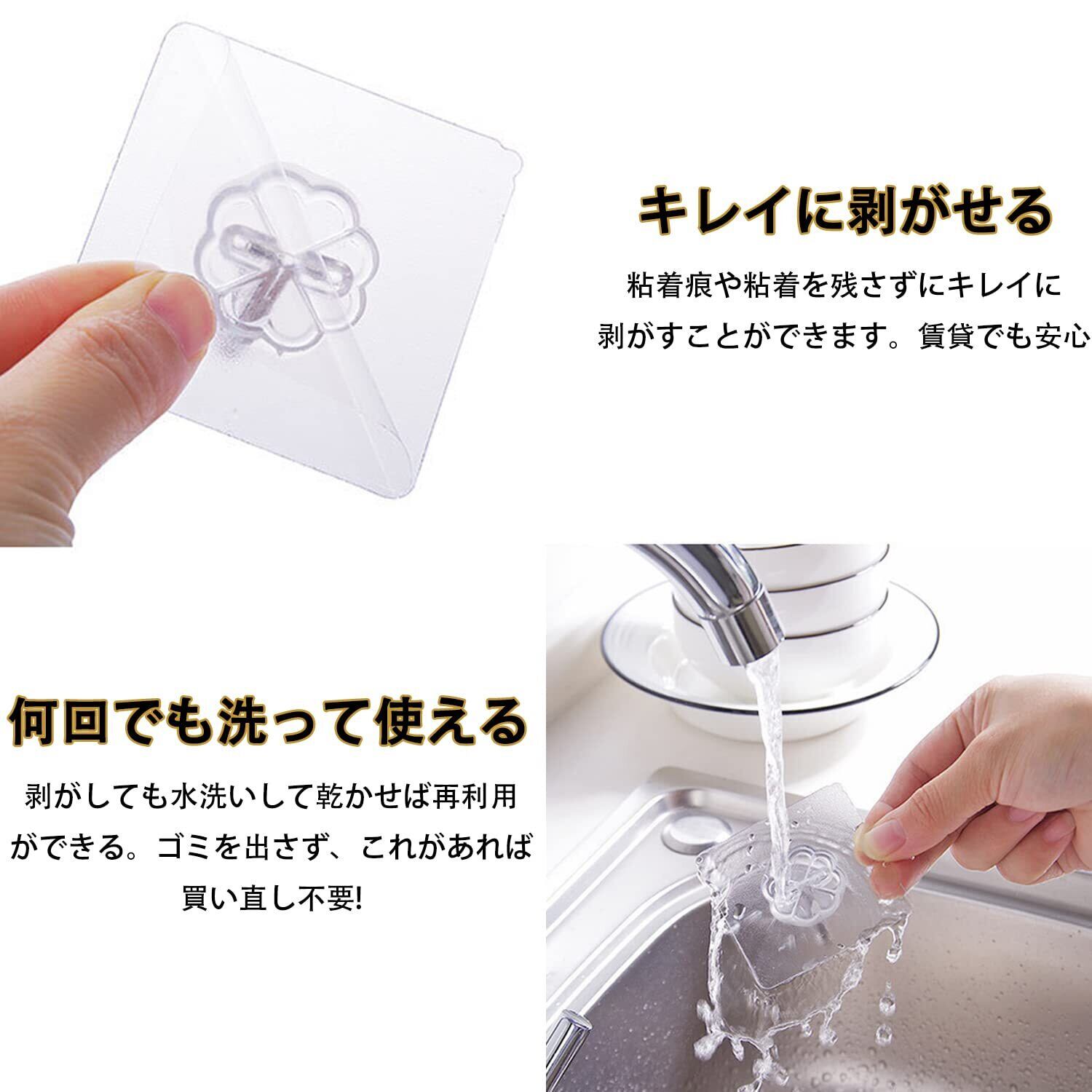 【繰り返し使える】 一度張り付けたフックも、粘着部分を水で洗ってドライヤーで乾かせば吸着力が復活し、 再利用ができるので経済的。 ただし、エンボスなど凹凸のある面に対しては設置面が完全ではないためご利用いただけません。 また、壁紙や塗装が剥がれやすい壁等にご使用いただくと、 フックを外す際に壁紙や塗装が一緒に剥がれてしまう恐れがありますので、ご注意ください。