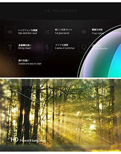 偏光レンズ:99%のUV400保護コーティング、有害な紫外線を100%ブロック、乱反射をカットして心地良い光を取り込むことで目への負担を軽減してくれます。レンズは9層です。1層は表層傷防止強化フィルムです。 2層は強化偏光レンズです。3、4層は6、7層と同じ、耐久性を増すために層を結合し、紫外線を吸収するUV400二層保護フィルムです。5層はPVA偏光濾過フィルムです。8層は強化偏光フィルムです。 9層は飛散防止ための底層耐圧強化保護フィルムです。