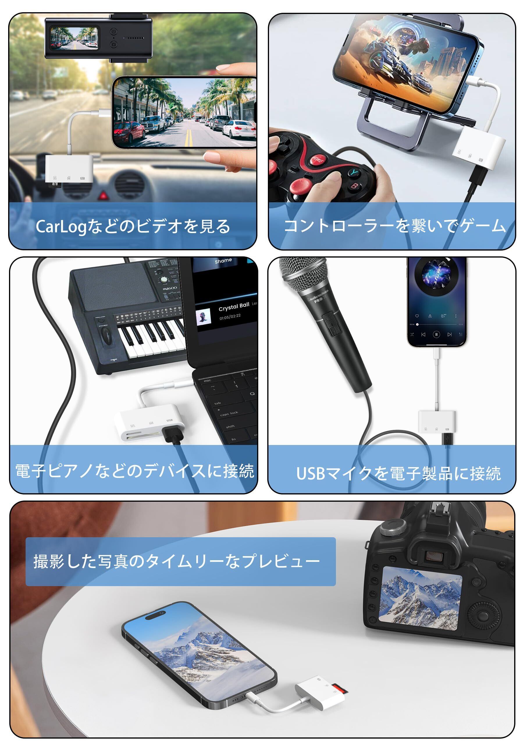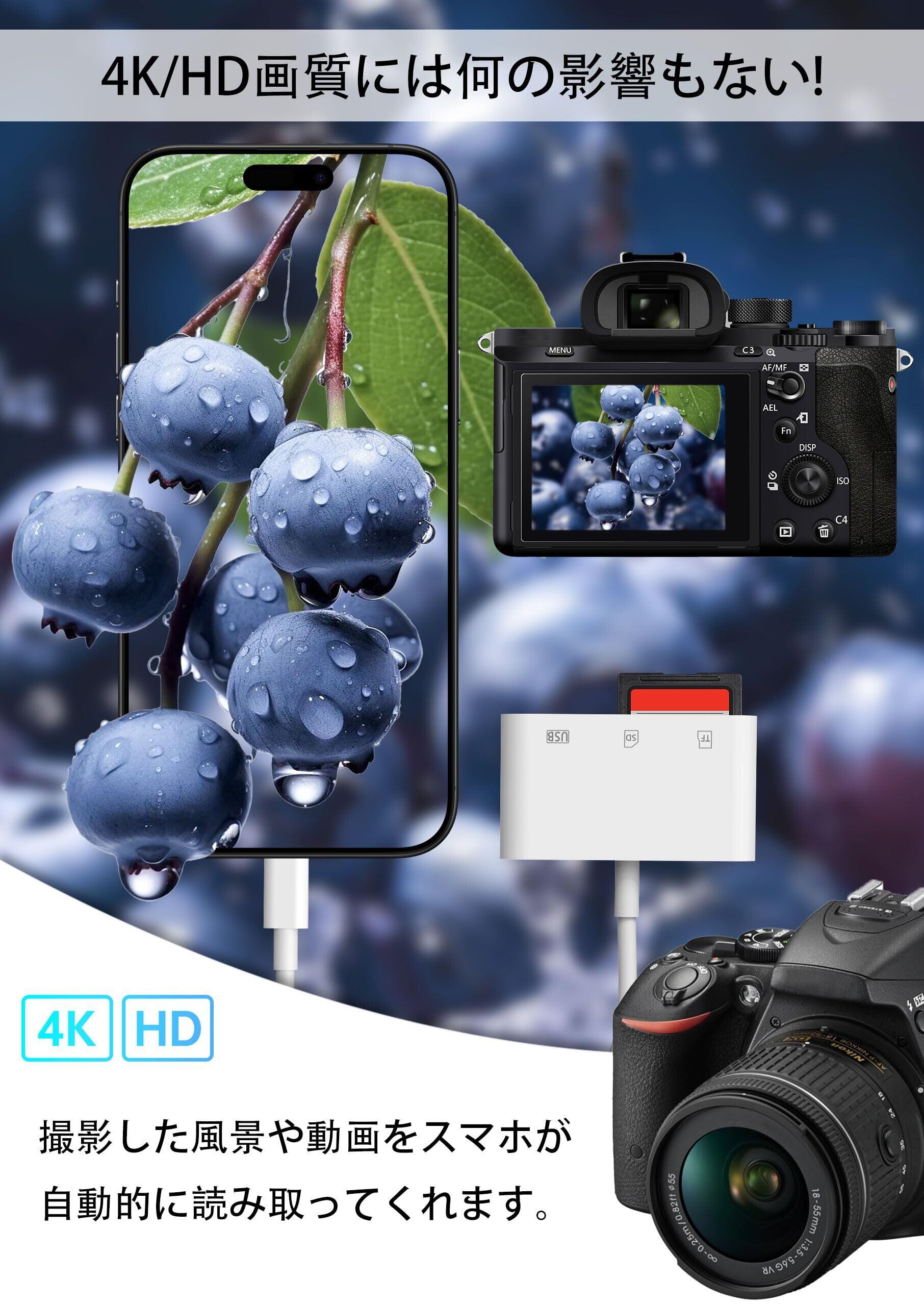 【3in1多機能SDカードリーダー】SDカード(SD/SDHC/SDXC/MMC)、TFカード(Micro SD/Micro SDHC/Micro SDXC)、USBポートを搭載しています。写真・動画・ドキュメント(Word/PPT/Excel)・ファイルの読み書きをサポートします。専用の「ファイル」アプリを開くだけで、データのインポートやエクスポートを双方向で簡単に操作できます。大容量の写真や動画、重要なドキュメントも、1本のリーダーで効率的に管理できます。