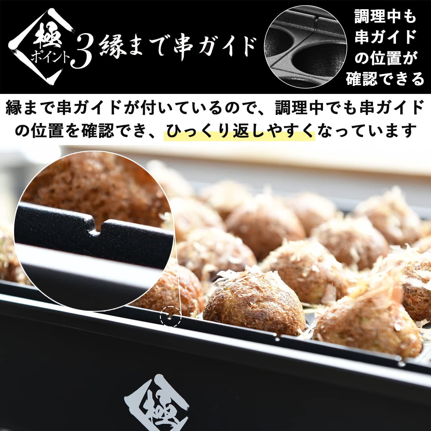 【縁まで串ガイド】各たこ焼き穴の間には串ガイドがついており、焼き穴からあふれたタネでたこ焼き同士がくっついても竹串などで簡単に切り離せ、形が揃ったキレイなたこ焼きが作れます。さらにフチまで串ガイドが付いているので、調理中でも串ガイドの位置を確認でき、ひっくり返しやすくなっています。