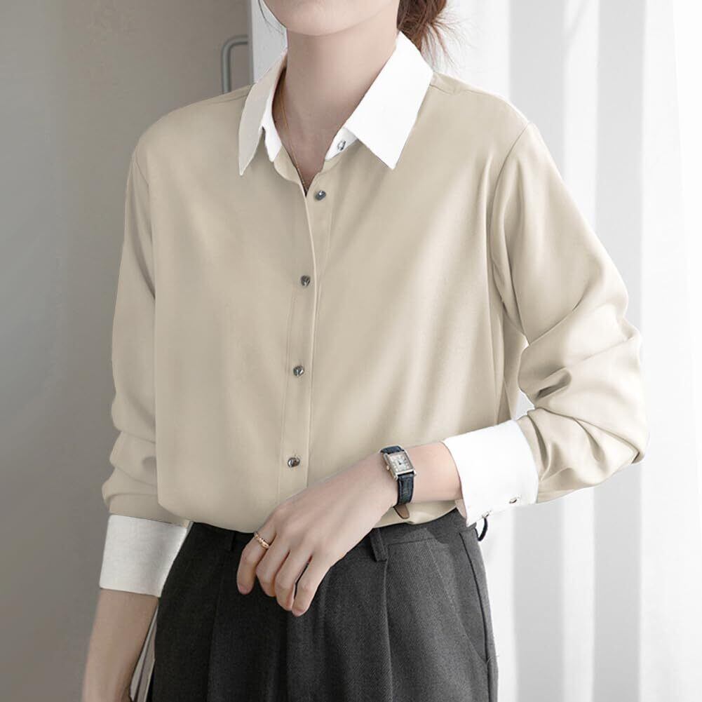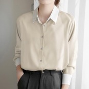 大人の抜け感が生まれているレディース長袖シャツです。バイカラーの配色がアクセントになり、全体的に単調さを解消しつつ、コーデ次第でトレンド感が一段とアップしてくれます。フロントや袖口に付けた釦がシルバーで目を惹いて、きれいめで華やかなブラウスです。ご注意:釦は菱形に近似した形で、釦の狭い方をボタンホールに合わせて掛けたり解けたりしやすくなりますので、お気になる方は予めご了承ください。バイカラーのデザインなので、浸け置き洗いや濡れたままの放置しないで、色落ちや色移りやすくなるので、洗濯後、必ず完全に絞ったり洗濯機で脱水したりしてからすぐに形を整えて日陰で干してください。