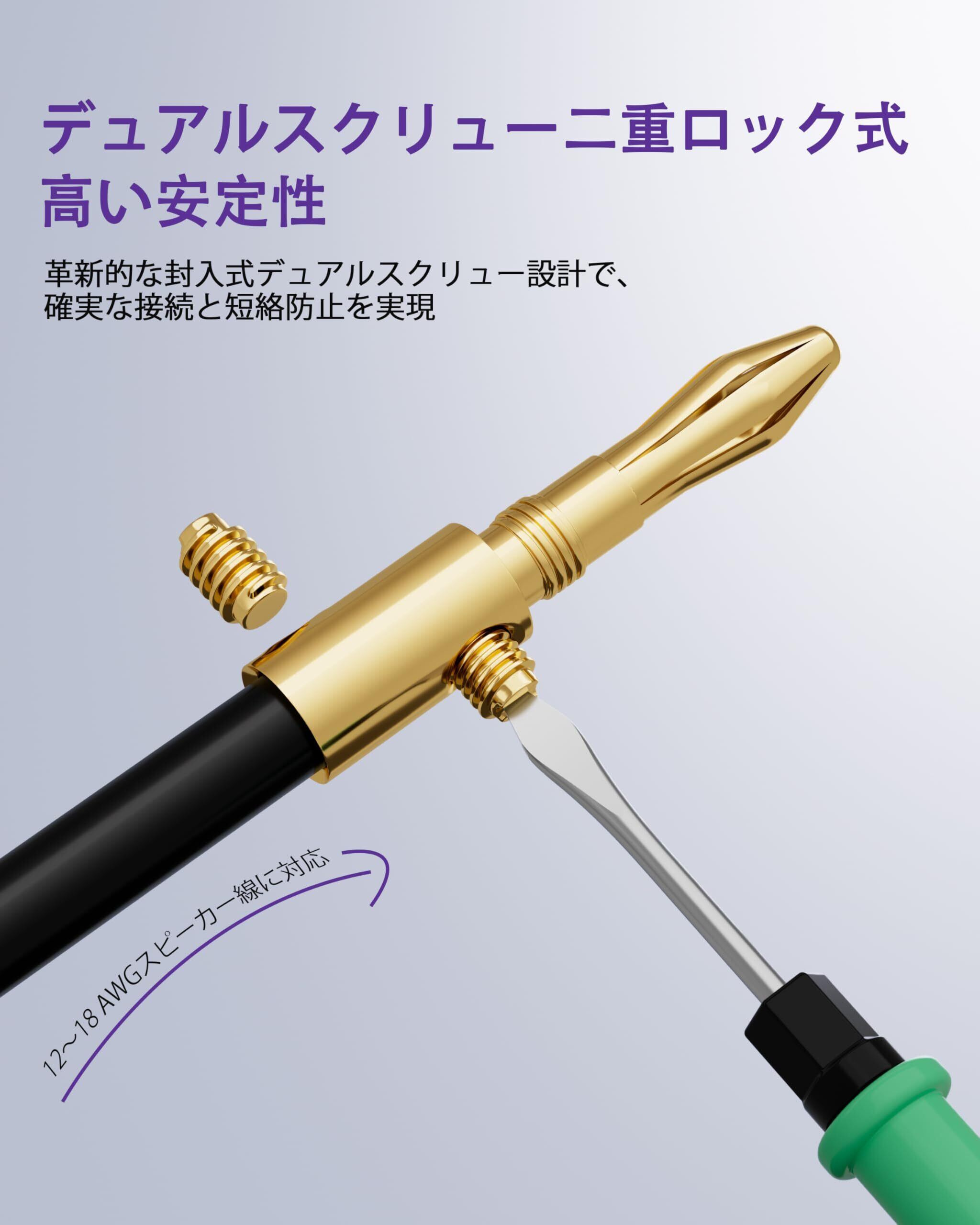 【二重ネジロック】24K金メッキのスピーカーケーブル バナナプラグは密閉型デザインを採用し、信号損失のない純粋でクリアなサウンドを実現します。デュアルスクリューが12-18 AWGスピーカーケーブルを確実に固定し、絶縁処理により短絡を防止します