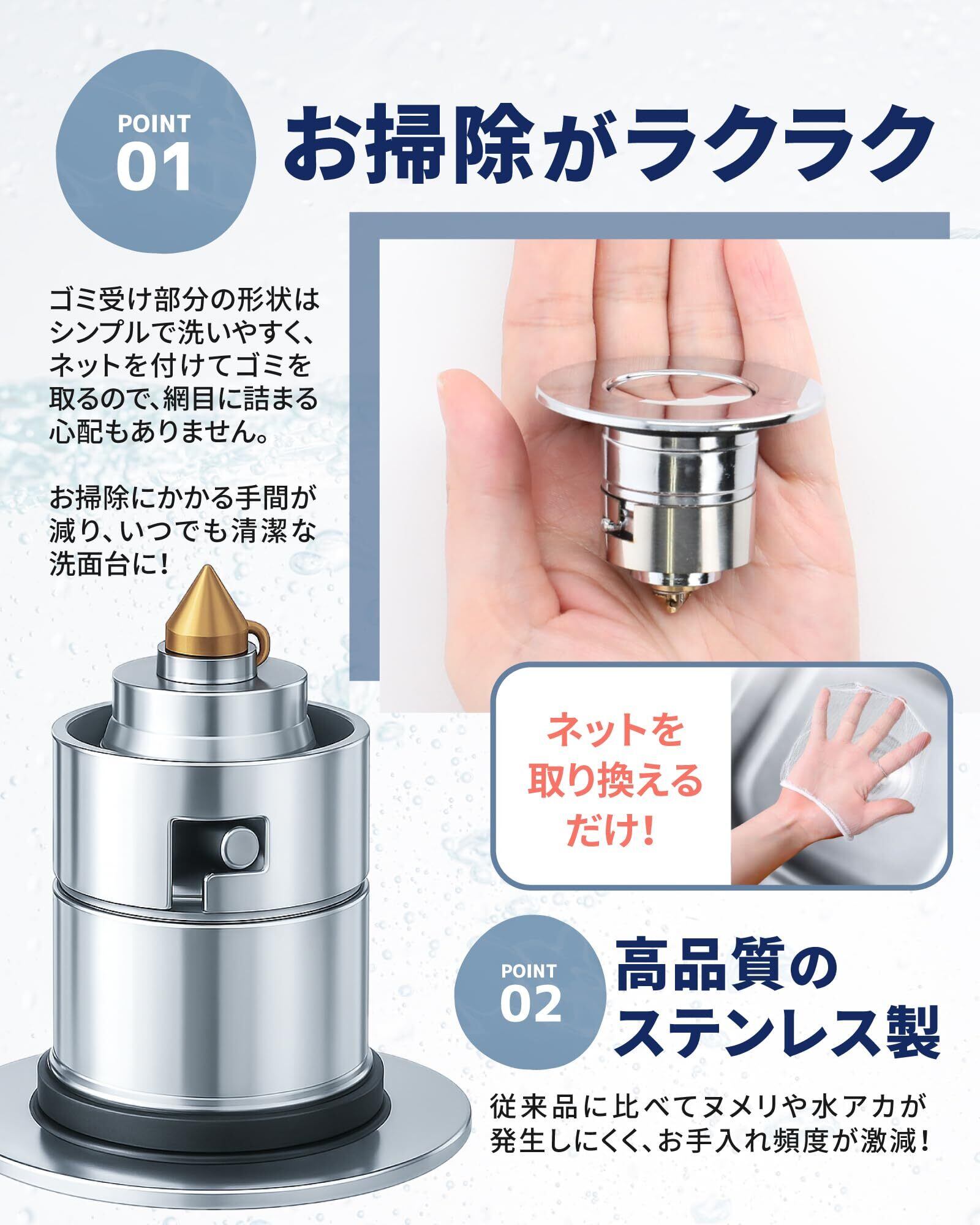 【✨ワンプッシュで貯水・排水を切り替え✨】 ◆ワンプッシュで貯水・排水を切り替え出来る排水栓としての機能を持つヘアキャッチャーです。水を貯めて付け置き洗いをしたり、洗面台自体を洗えたりと、何かと便利なのもポイントです。