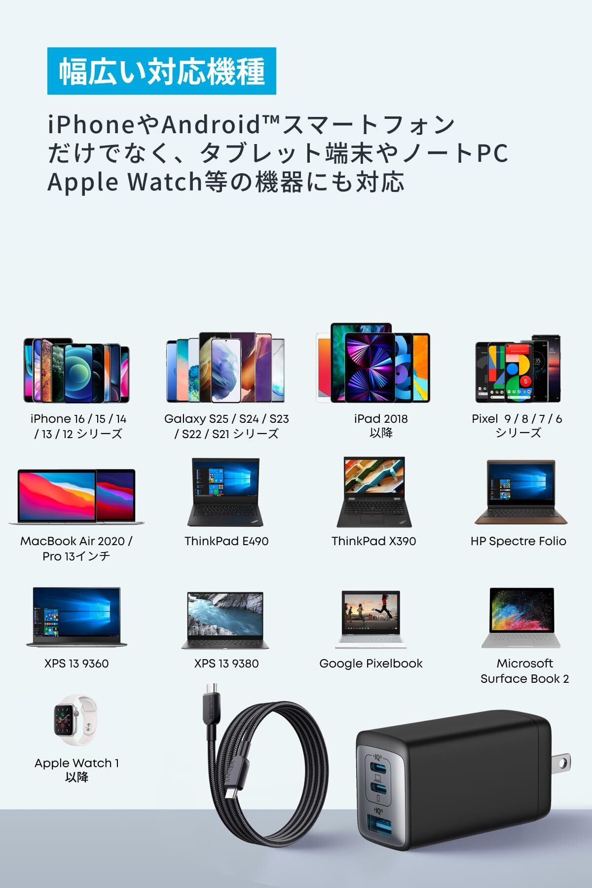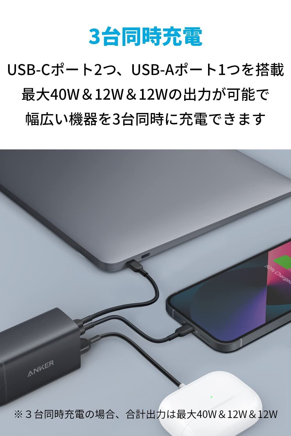3台同時に充電可能:スマートフォン、タブレット、MacBook、USB PD対応のWindowsノートPCなど、多種多様なデバイスを一度に充電可能。PowerIQ 3.0 (Gen 2) を 搭載した2つのUSB-CポーとAnker独自技術PowerIQ搭載のUSB-Aポートを備えています。3ポート利用時の合計最大出力は65Wと高出力。機器毎に異なる充電器を持ち運ぶ必要はありません。※3ポート利用時の合計最大出力は64W