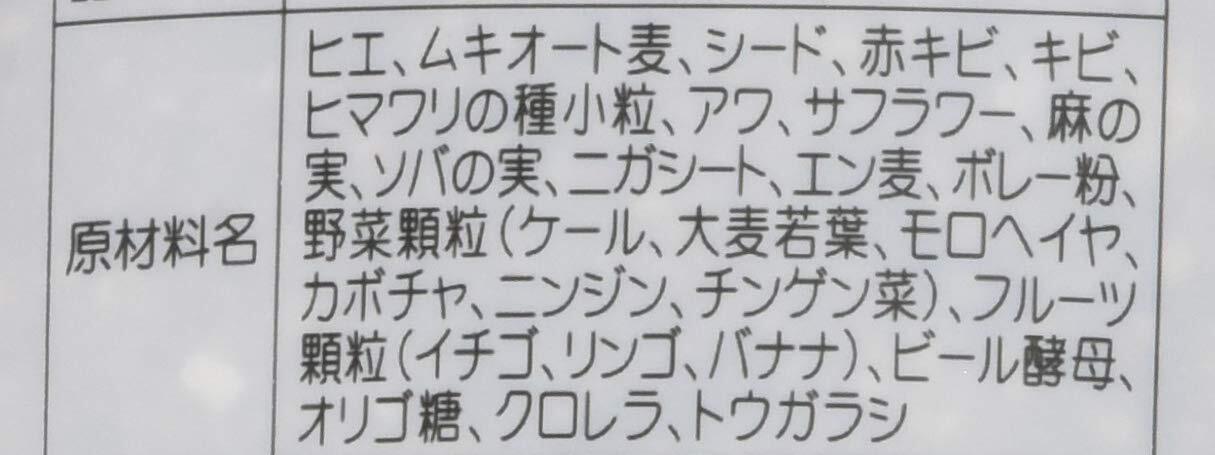 ヒエ、ムキオート麦、シード、赤キビ、アワ、キビ、クロレラムキオート麦、サフラワー、麻の実、ソバ、ヒマワリ小粒、黒ヒマワリ、ニガシード、エン麦、ボレー粉、野菜顆粒(ケール、大麦若葉、モロヘイヤ、カボチャ、ニンジン、チンゲン菜)、フルーツ顆粒(イチゴ、リンゴ、バナナ)、ビール酵母、オリゴ糖、クロレラ、トウガラシ