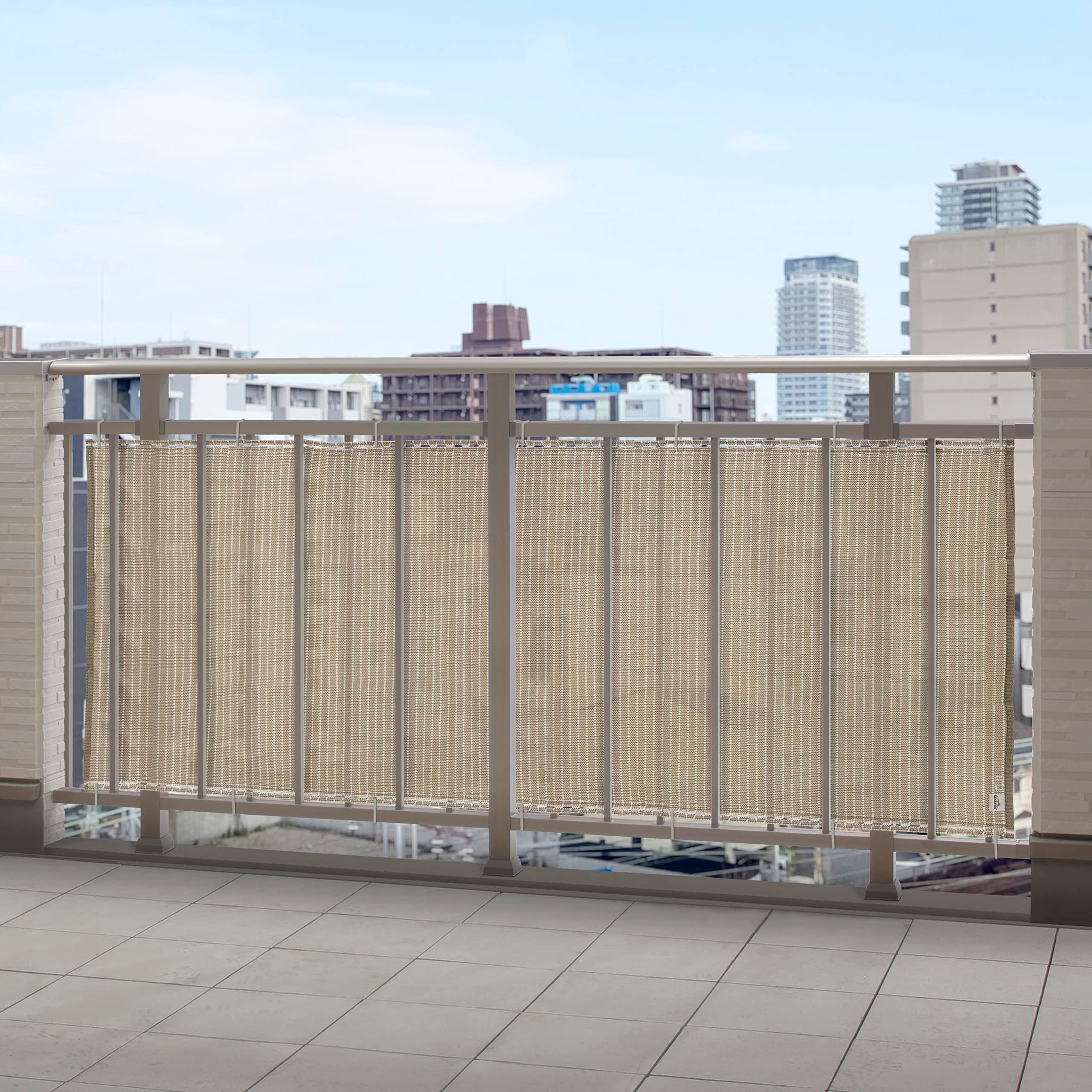 バルコニーの目かくし。3年()。軽量設計で1m²あたり125g扱いやすさを実現。風をとおす。飛ばし編み加工により、従来品の1.4倍の通気性。(従来の飛ばし編みをしていない生地との比較)