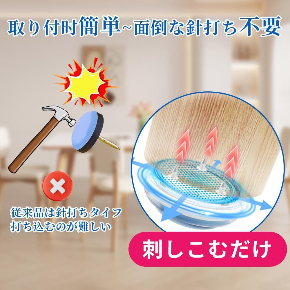 3本針で外れにくく・安定感抜群:この椅子脚カバー3つの釘と超強力な両面テープで二重固定、取り付け後も外れにくく、安定感が抜群です。超強力テープを使用し、両面テープのみで取り付けた場合と比べ、5倍の強度を誇ります。強力に固定されるので、長時間の使用でも安心です。