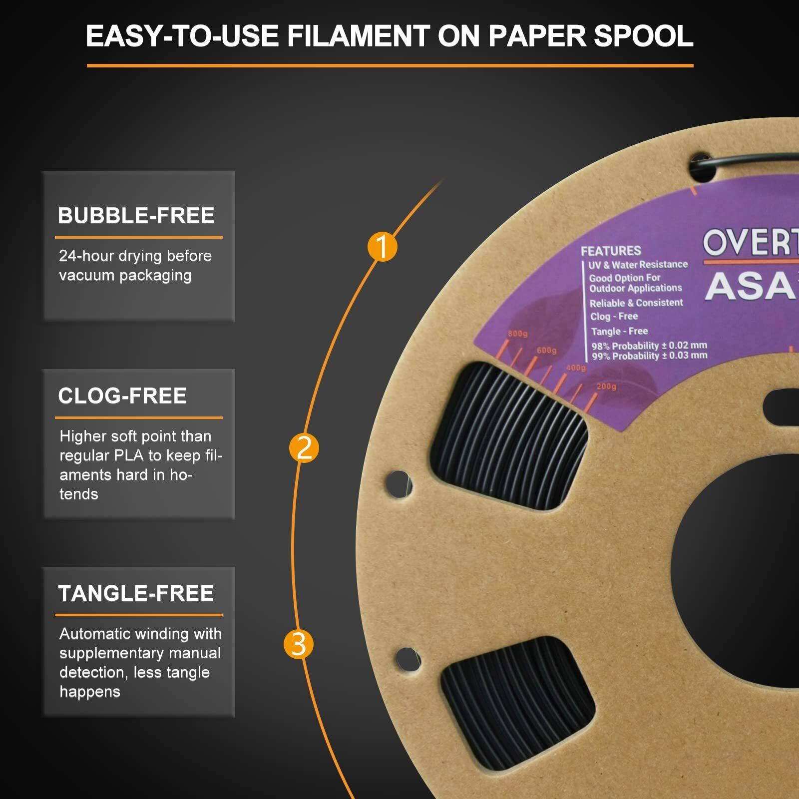 【目詰まりなし&泡なし】OVERTURE ASAは最新の配合で開発された、強化された複合炭素繊維ASA材料です。80%と炭素繊維20%で構成され、軽量、高強度、および靭性が強化されています。通常の1.75mm ASAフィラメントに比べて脆く変形しにくいです。