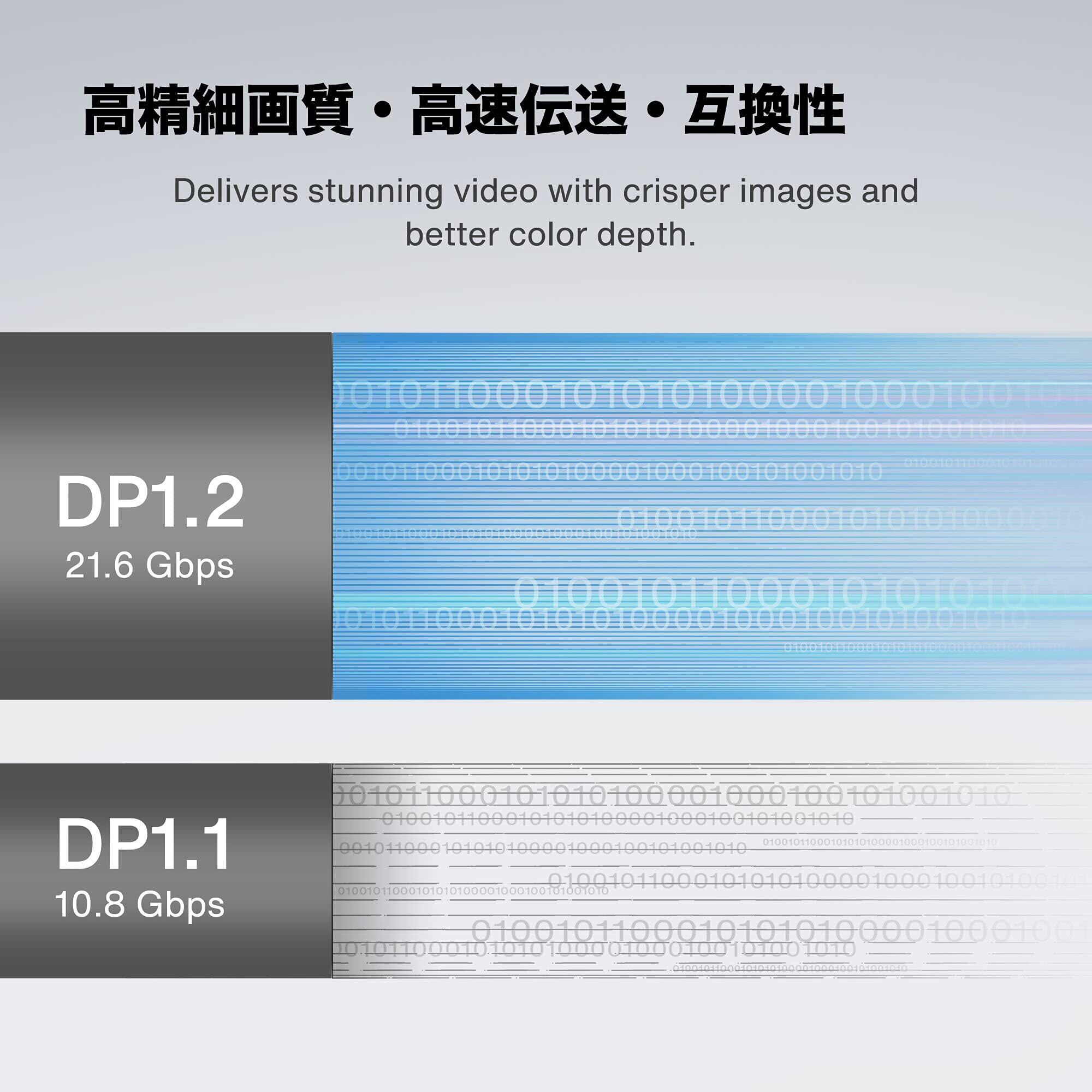 【VESA認証 21.6Gbps高速伝送】 業界標準VESA認証を取得したディスプレイケーブル。DisplayPort 1.2対応のDisplayPort ケーブルは、HD 4K、フルHD、3D映像、音声と映像の同期出力、高速伝送21.6Gbpsを実現します。1本のディスプレイポート ケーブルで、ディスプレイポートが付いたPCをHDTV、モニター、ゲーム用グラフィックスカードに直接接続し、クリアなオーディオと高精細なビデオを伝送できます。