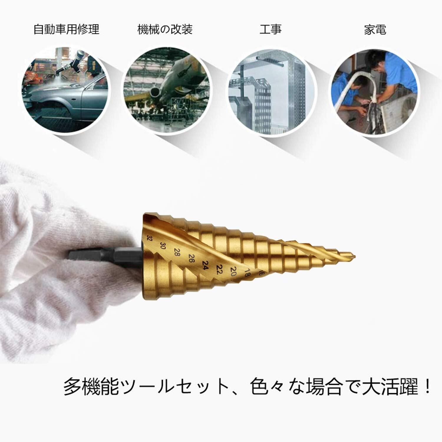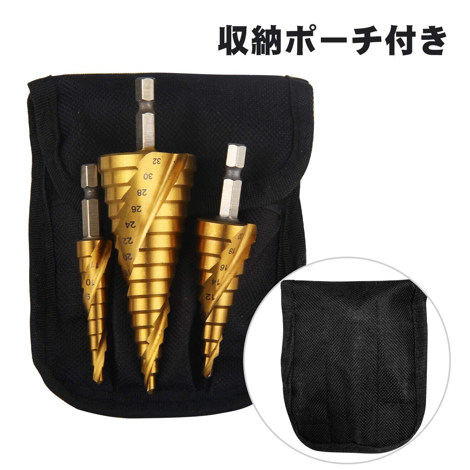 ステップドリル ONUEMP 六角轴 3本セット らせん状 もっと鋭い チタンコーティング スパイラル hss钢 ドリル 螺旋 六角轴スパイラル (3本セット【4-32mm/4-20mm/4-12mm】)