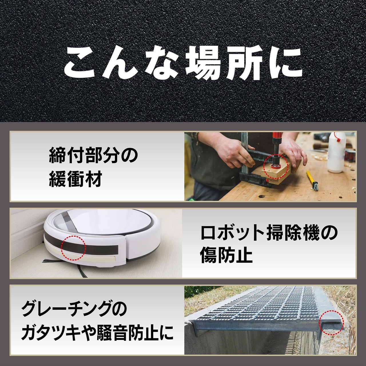 【DIYや日常の修理にぴったり】 家具や床の傷防止、滑り止め、機械の振動吸収、異音や共振対策、グレーチングの衝撃吸収、騒音防止、隙間埋めなど多用途で使用可能です。カットして使えるためDIYの自由度が高く、細かな修理や補強にも最適。クッションゴム、クッションテープとして防音対策にも活用でき、家庭やオフィス、工場で大活躍します