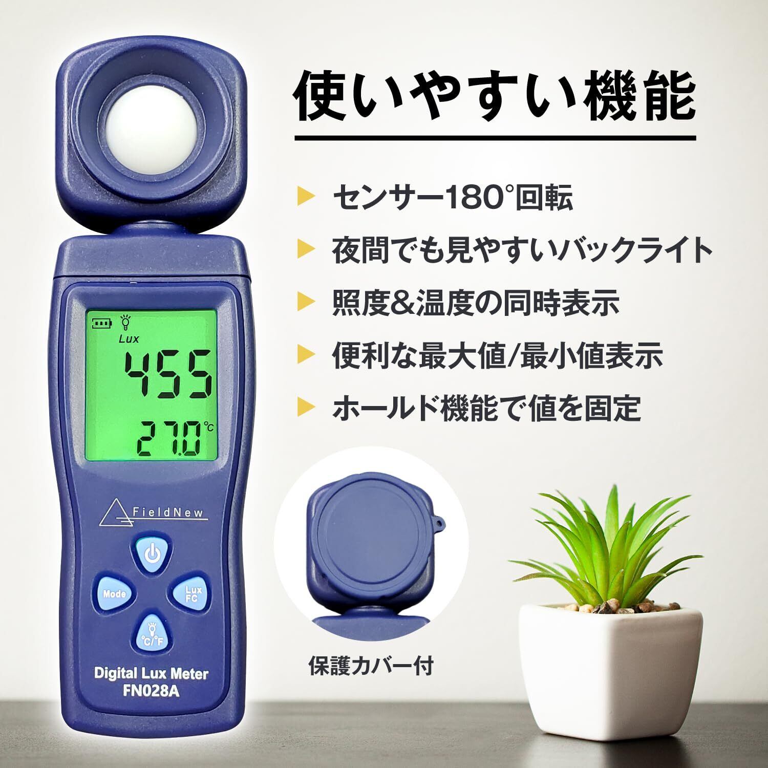 FieldNew デジタル照度計 ルクスメーター 200,000Lux 180度回転センサー 日本語説明書 動画解説 照度&温度 植物育成ライト 室内照明 撮影