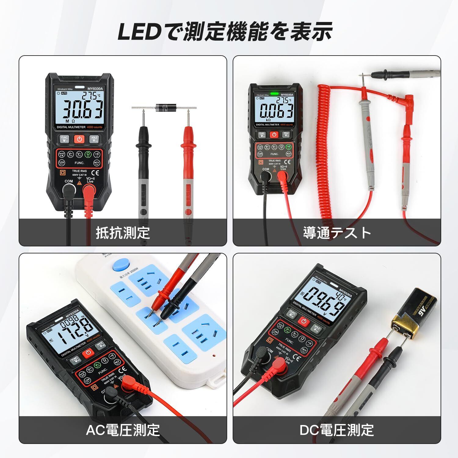 【スマートテスター】Hinokami NikaオートレンジマルチメーターMY8330Aは、TRMS4000カウントで、手動で測定することの上に、オートモードにより、電圧、抵抗、導通など機能を自動的かつ迅速に識別できます。交流電圧を測定するとき、周波数も表示されます。初心者から車のメンテ、自宅での作業まで幅広くご利用いただけます。