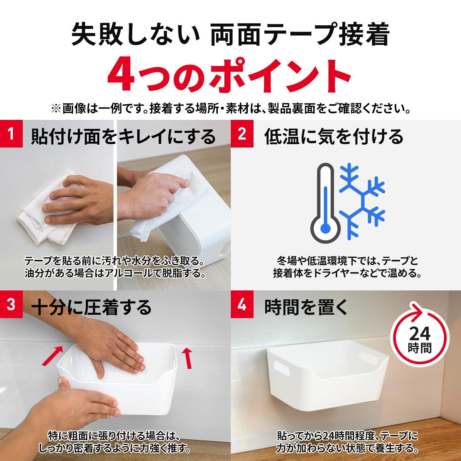 【工具いらずで、パパッと取り付けられる! 】工具を使わずに手軽に取り付けられます。両面テープを貼る前に、貼付け面をきれいにし、油分を取り除いて貼り付けるだけ! テープ本来の接着力がでるまでに約1日かかります。