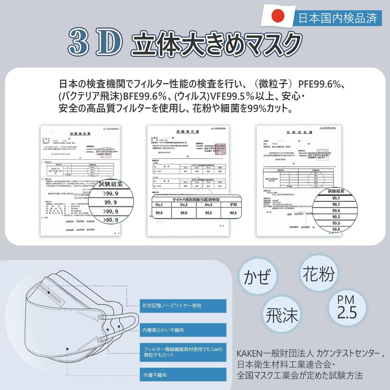 【日本KAKEN検品】立体構造の高密度フィルターを採用!日本の検査機関でフィルター性能の検査を行い、(微粒子)PFE99.6%、(バクテリア飛沫)BFE99.6%、(ウィルス)VFE99.5%以上、安心・安全の高品質フィルターを使用し、花粉や細菌を99%カット。