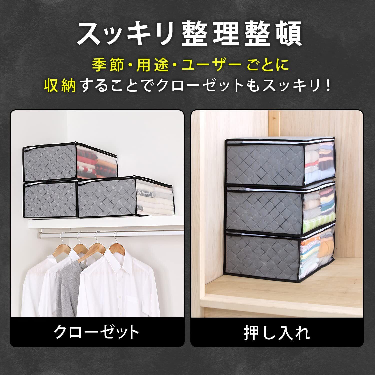【商品仕様】:サイズ/約幅48×奥行35×高さ20cm、カラー/グレー、内容/3枚、収納目安(袋1枚あたり)/セーターやトレーナーなら約5~7枚・長袖シャツなら約20~25枚、材質/ポリプロピレン・活性炭・ポリエチレン