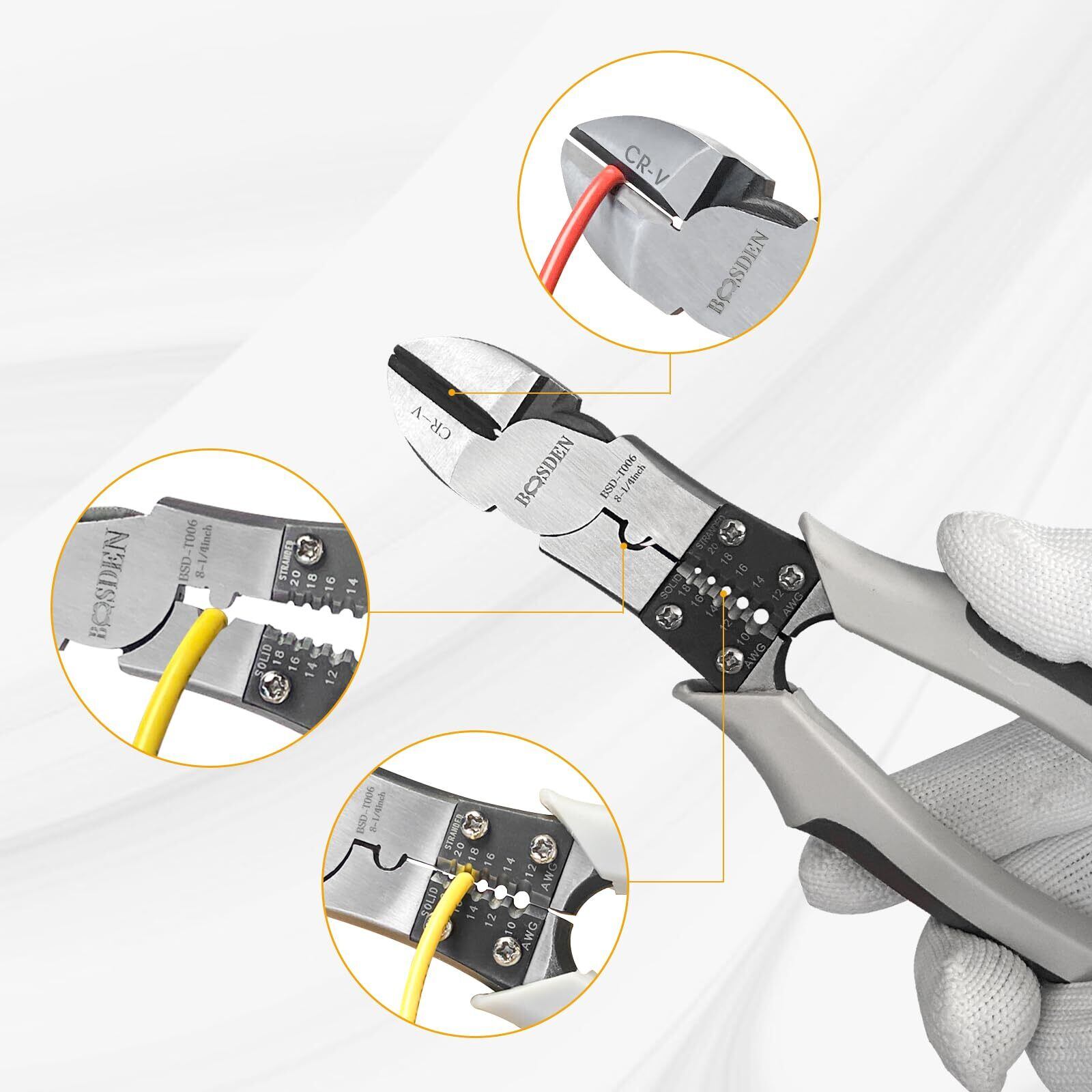 【多機能】 精密ニッパ、 ワイヤーストリッパー、ワイヤーカッターがすべて1つに、ワイヤーが切断できて、電線の被覆を剥くこともできます、圧着機能も付きます。
