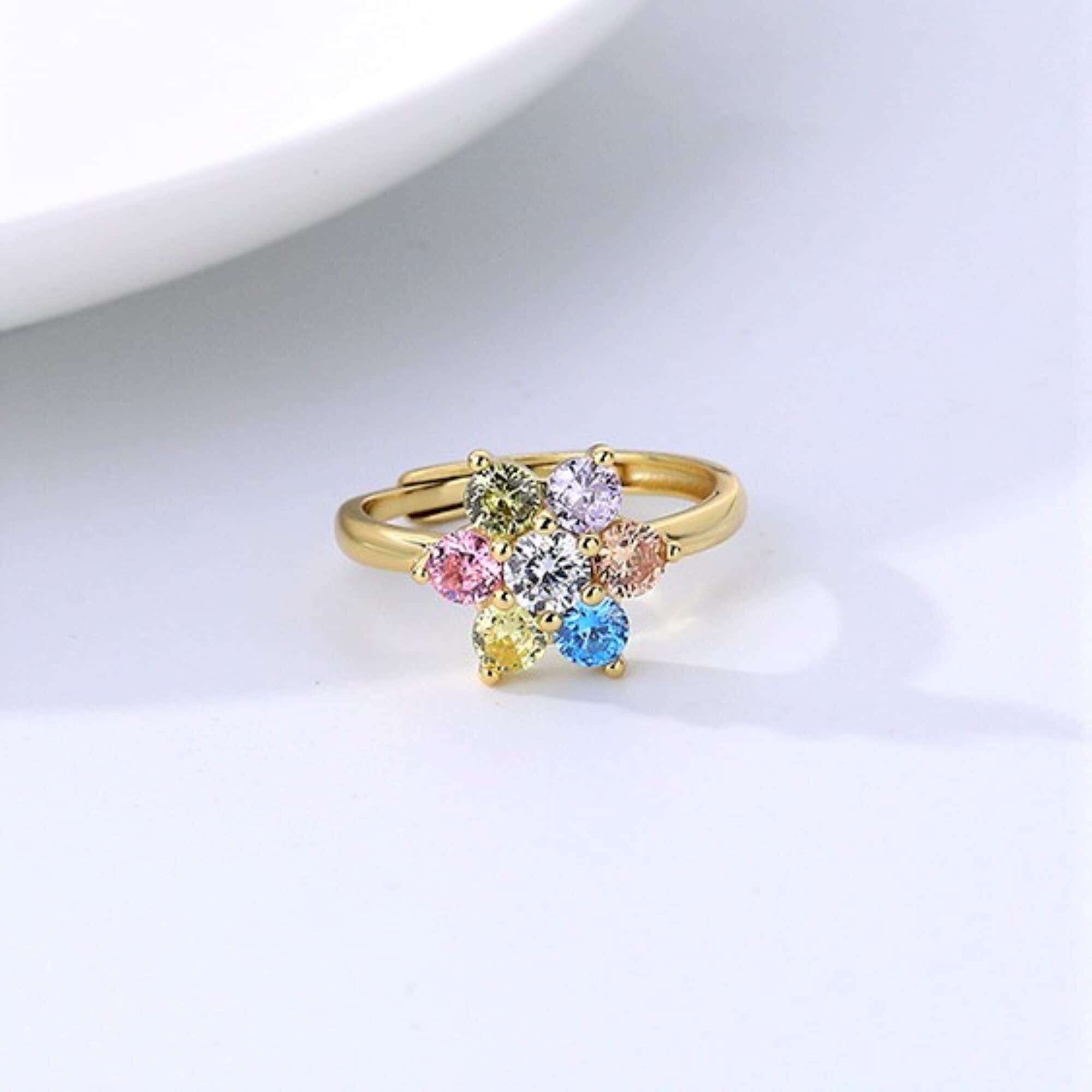 Bellitia Jewelry ジルコニア 指輪 花モチーフ マルチカラー レディース おしゃれ シルバー925 金メッキ リング 調整可能 華奢 婚約 プロポーズ エンゲージ アクセサリー