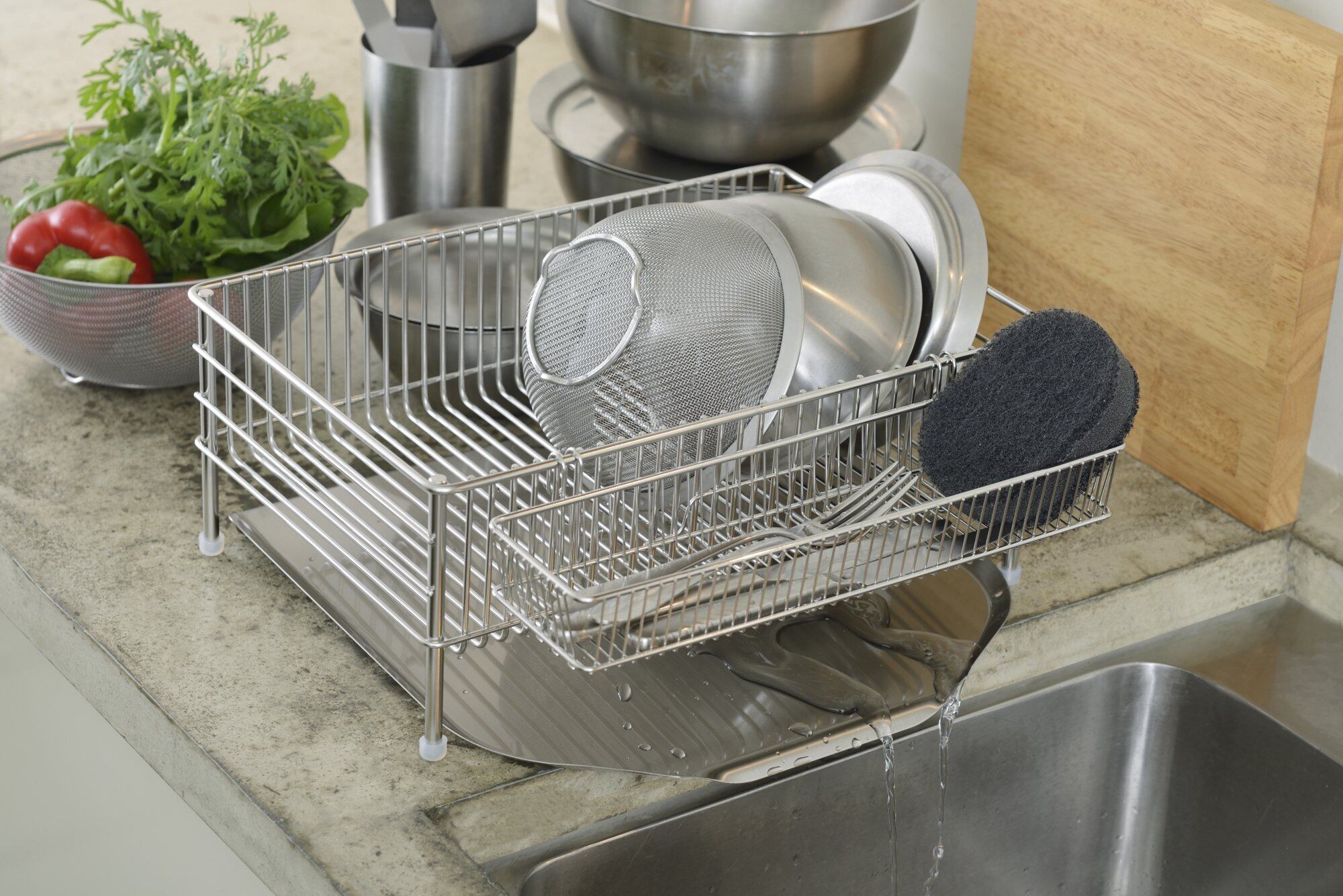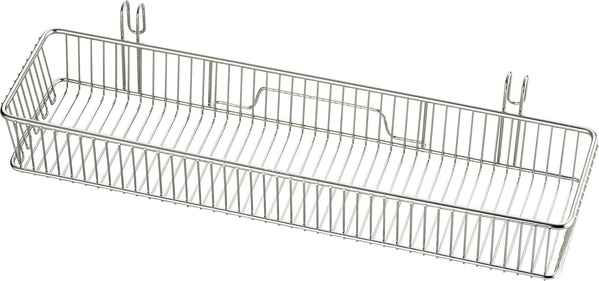 水切りかご(小)と組み合わせてご使用ください。 ワイヤーシェルフに引っ掛けて小物入れとしてもお使い頂けます。 18-8ステンレス鋼を使用しています。 底に溶接部分が無いので、汚れが付きにくく、洗いやすい形状です。菜箸等、長い物も水切りできるので便利です。