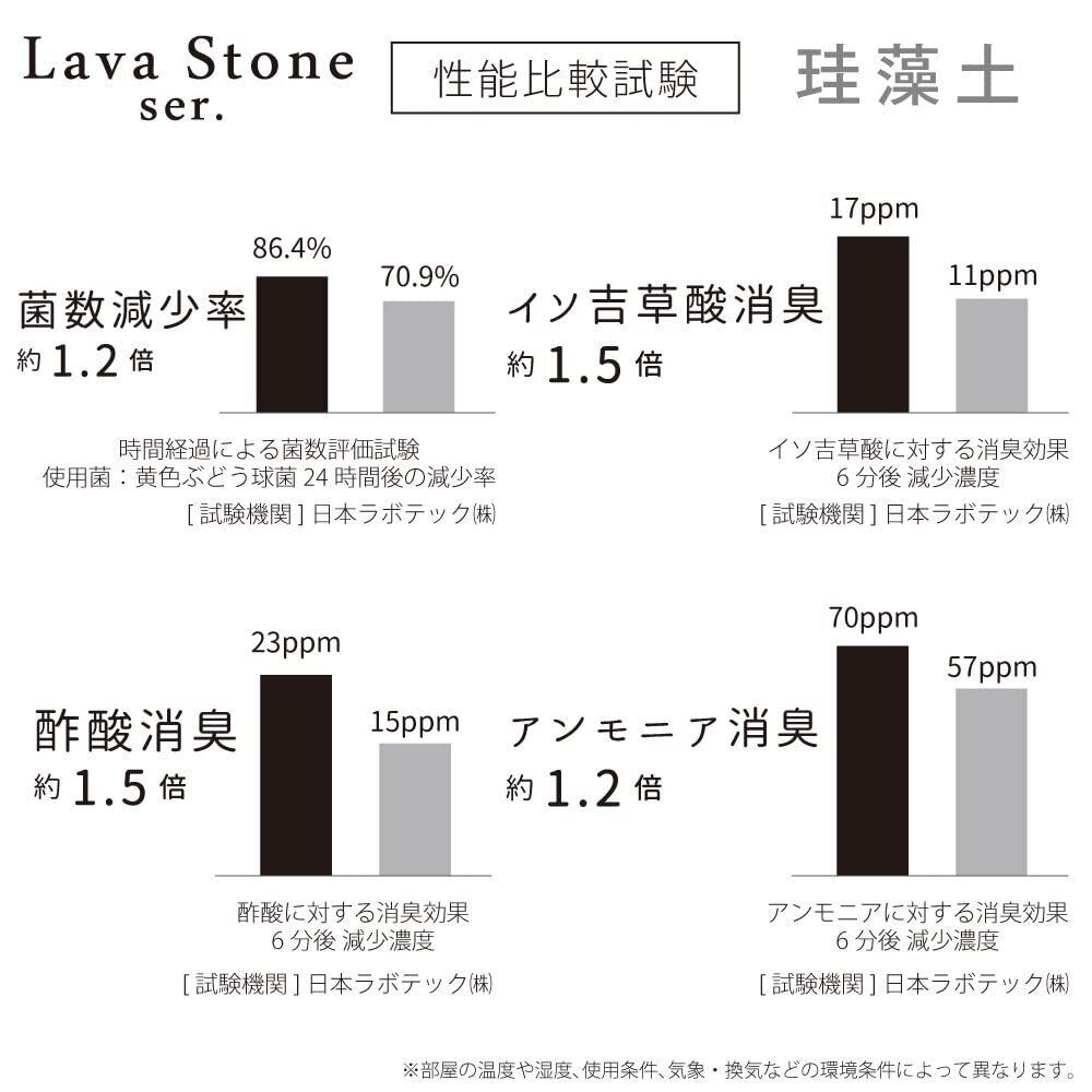 試験機関にて従来の弊社珪藻土製品と製品比較を行い、吸水・乾燥性・菌減少率・消臭効果の全てに於いて約1.2~1.5倍の性能が確認されました。