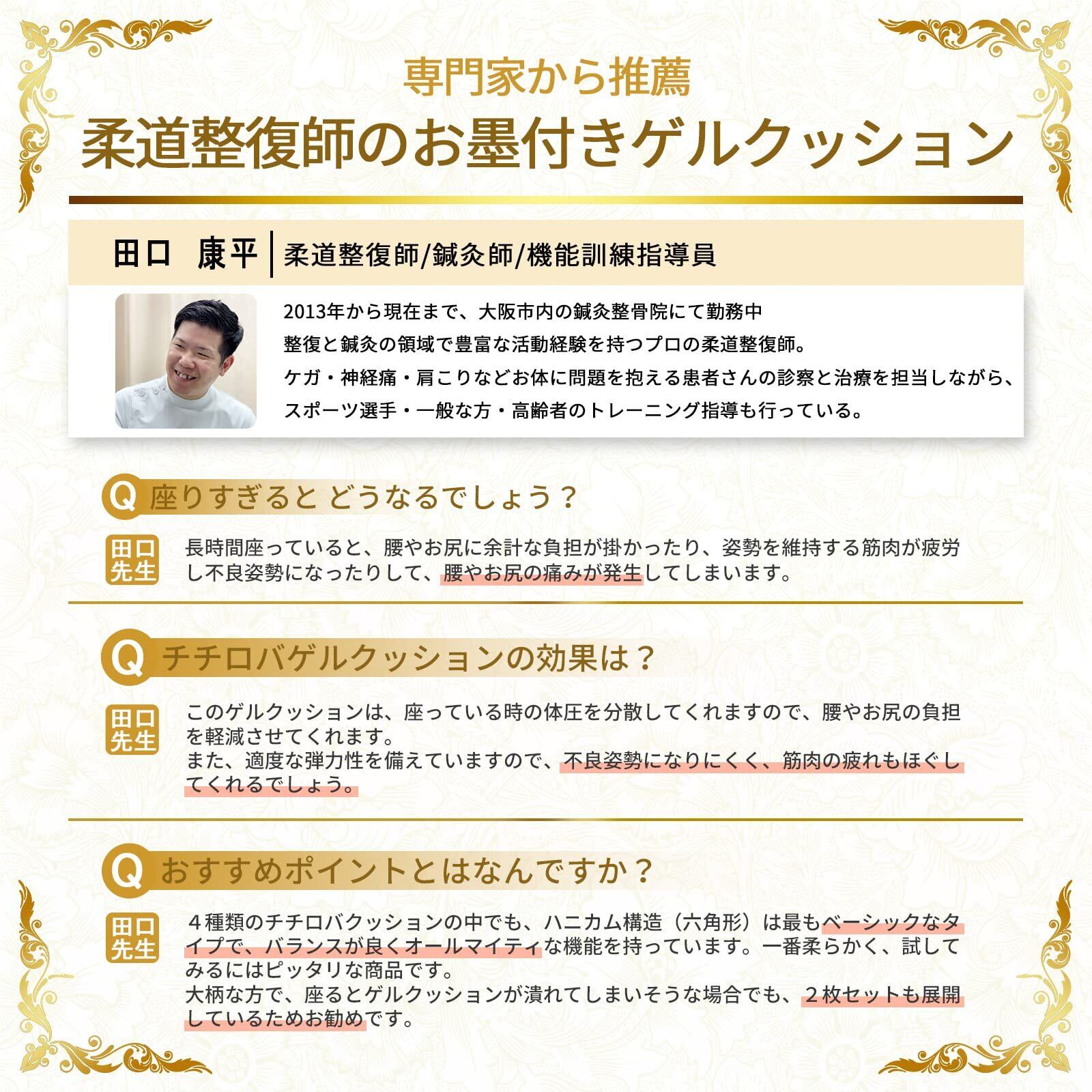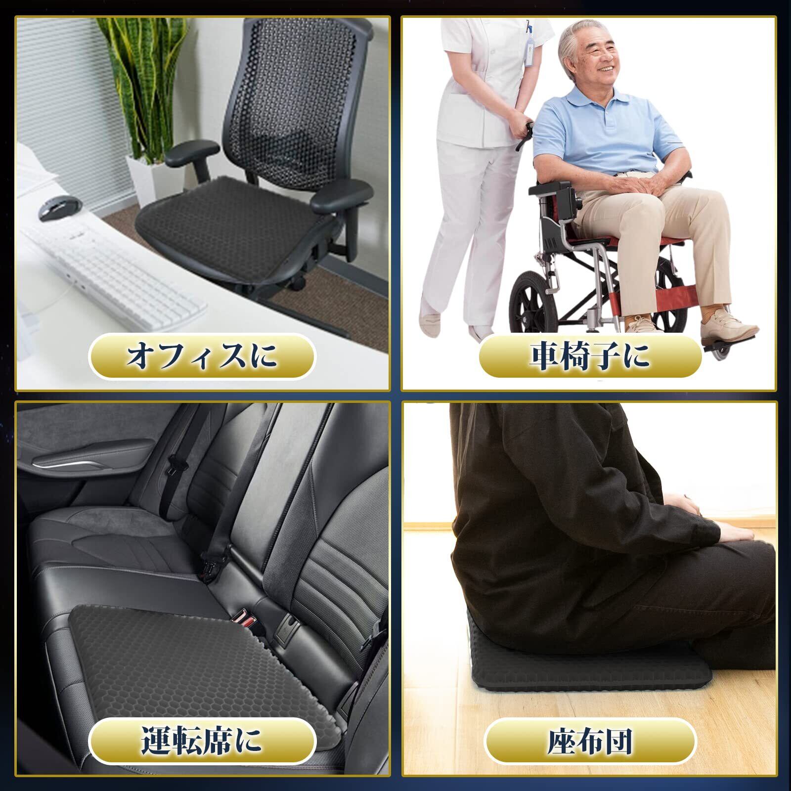 【ジェル素材・衝撃吸収】クッション性に富んだゲル素材を使用。ジェルクッション特有のクッション性で座るとき体の重さと座面からの圧迫を吸収。おしりにやさしい。