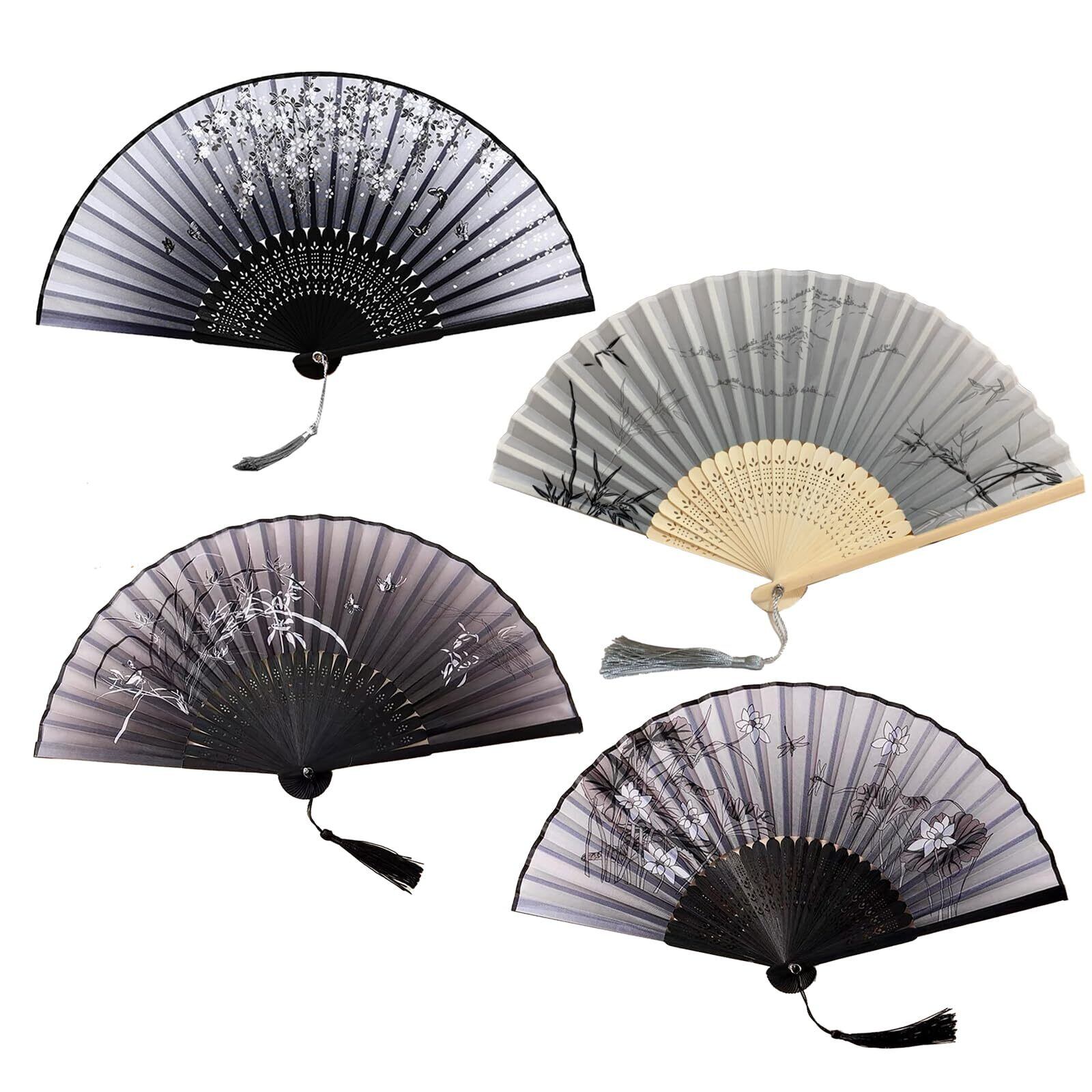 [YINKE] シルク扇子 4本セット絹 高級シルク扇子 花柄 蝶々桃の花 蘭 梅の花 竹製工芸品扇 和風扇子 おしゃれ 女性 紳士用 和装小物 (たまにランダムパターンがあります)