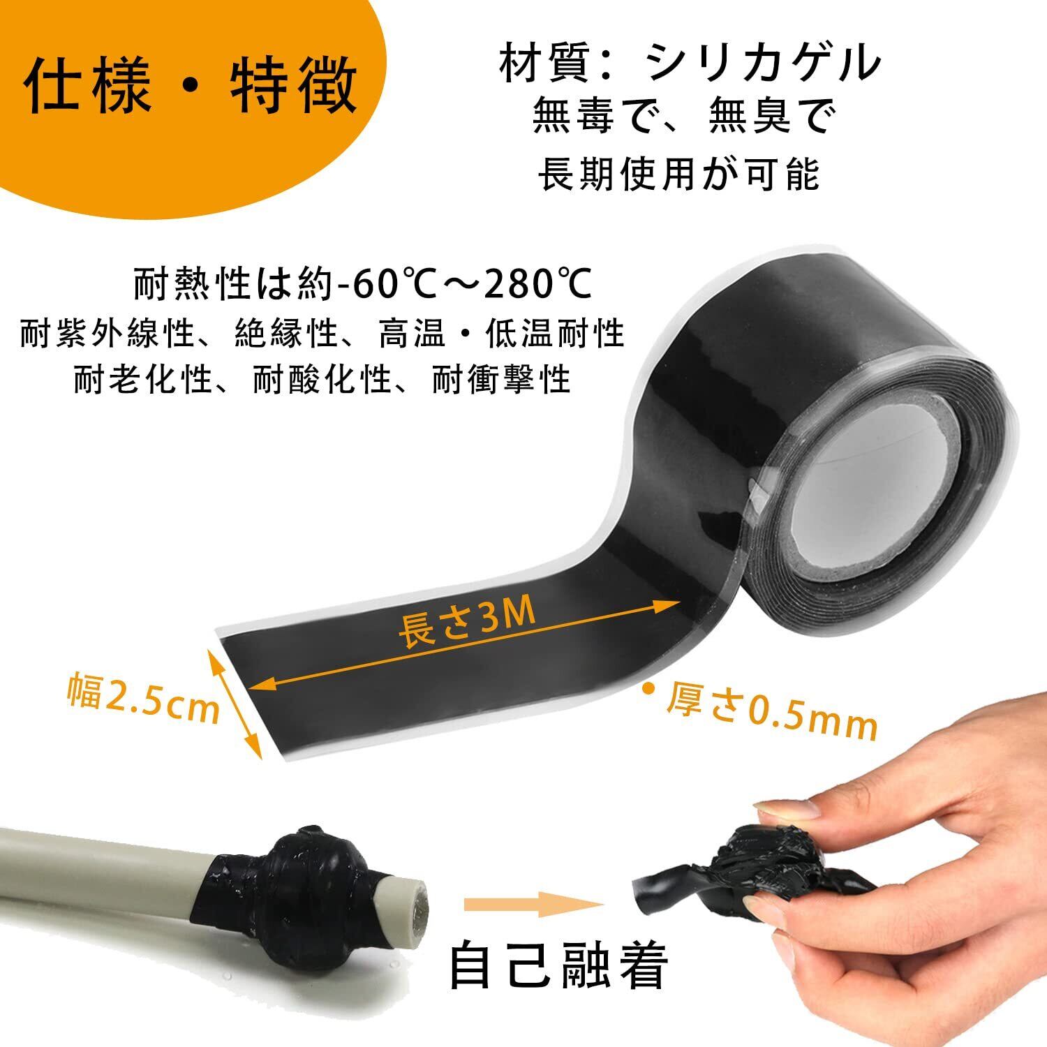 【サイズ】幅25mm、長さ3m、材質:シリコーンゴム、使用温度範囲:-60~280度。防水性と強力な接着剤のある自己融着テープです。