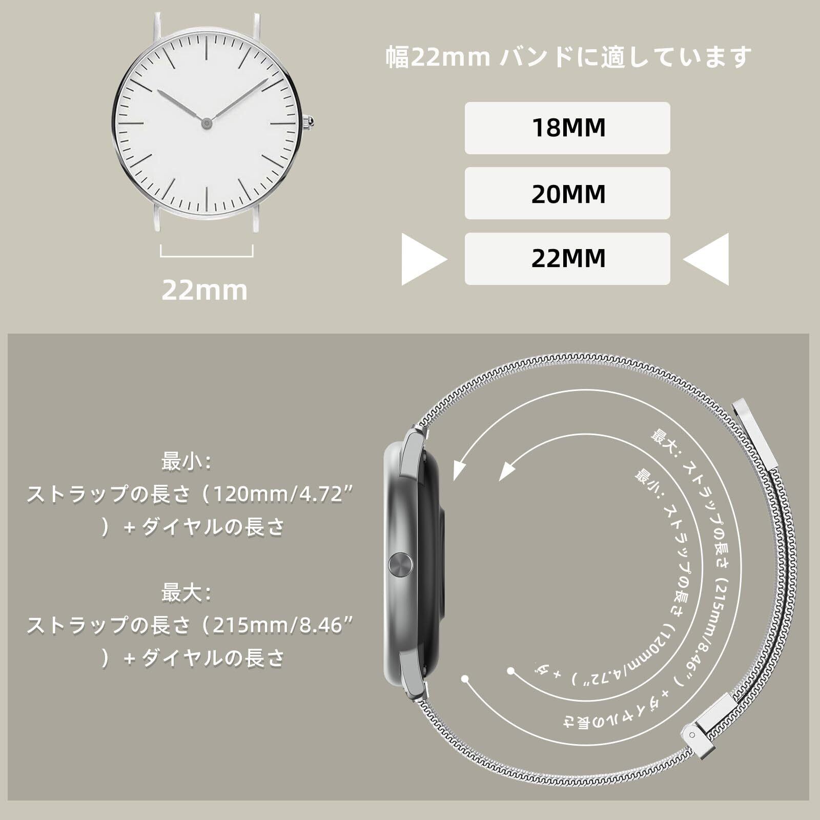 【ラグ幅対応】 幅22mm バンドに適しています。購入前に時計のラグ幅を確認してください。ラグ幅が22mmの普通時計とスマートウォッチに交換性があります。詳しくは下記の商品説明にご覧ください。ご理解いただいた上で、ご購入をお願い致します。【バンドサイズ】本バンドのサイズは120mm~215mmです(ご注意:時計本体の長さを含めません)。
