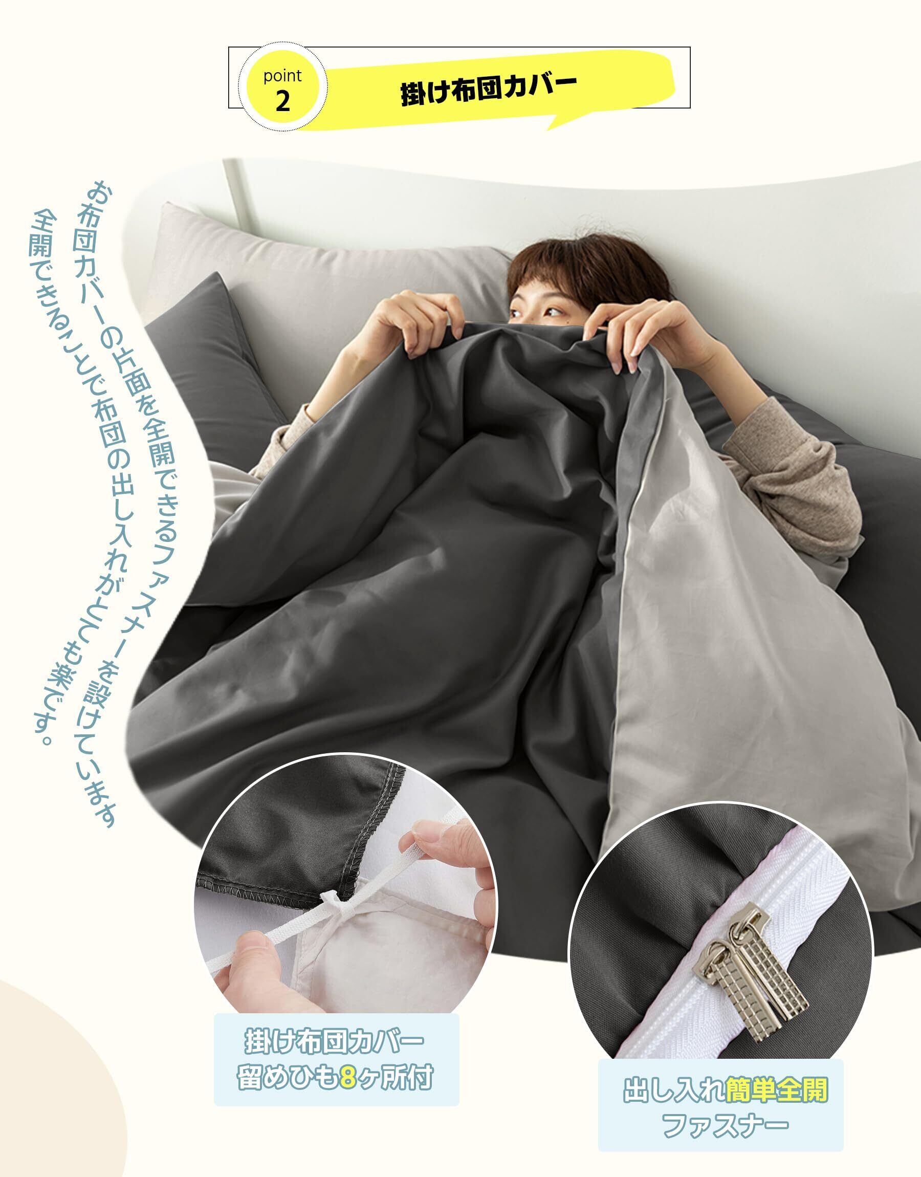 【セット内容・仕様】「掛け布団カバー・150x210cm(1枚)」:片側にファスナーを使用、布団留め紐8ヶ所付き。「ボックスシーツ・100X200+30cm(1枚)」:全周ズレ防止ゴム付き、高さ3-28cmの敷き布団とマットレスの底まで包むことが可能。「枕カバー・43X63cm(1枚)」:封筒式で出し入れが簡単です。
