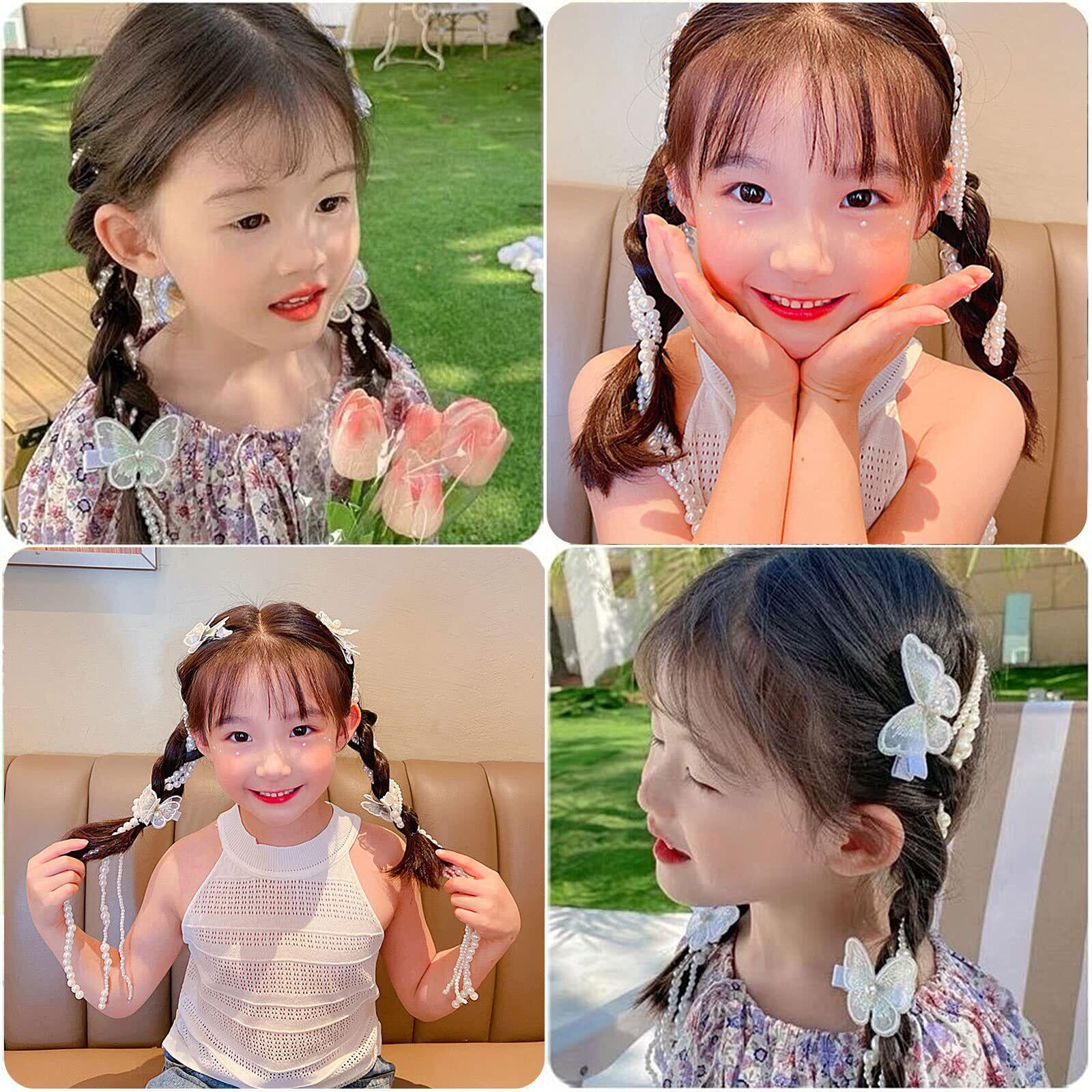 【素材】ヘッドチェーンヘアアクセサリーは、軽くてツヤのあるABSビーズを使用しています。 白い蝶のクリップは、刺繍模様が施された高品質の生地でできており、とても美しいです。