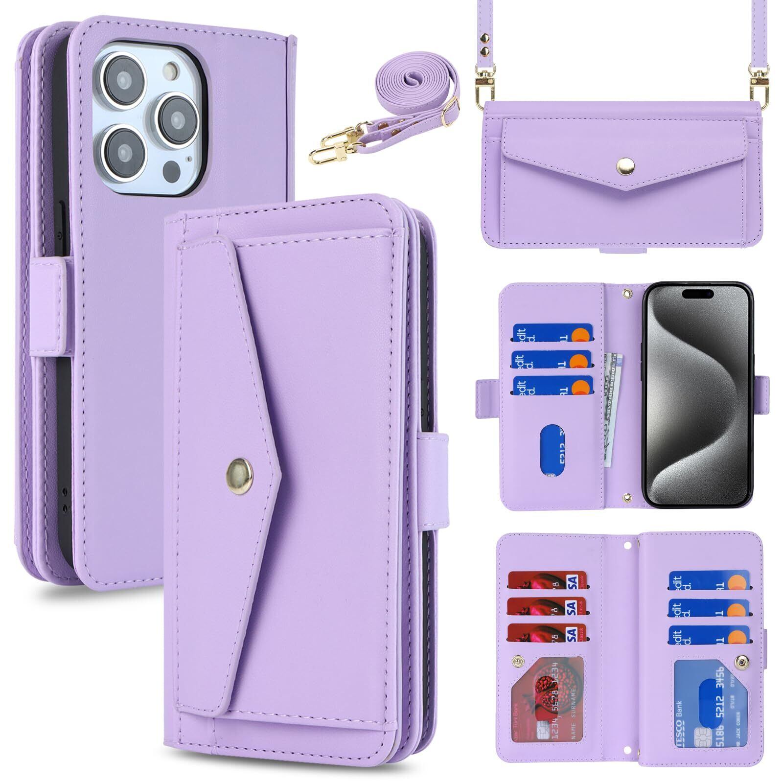 【Hamany】 iphone 15 pro ケース 手帳型 スマホ ショルダー アイホン15プロケース カード収納 大容量 スマホケース iphone 15pro スタンド機能 財布型 耐衝撃 耐久性 全面保護 女性 肩がけ 首掛け 斜め掛け ショルダー 携帯カバー -パープル
