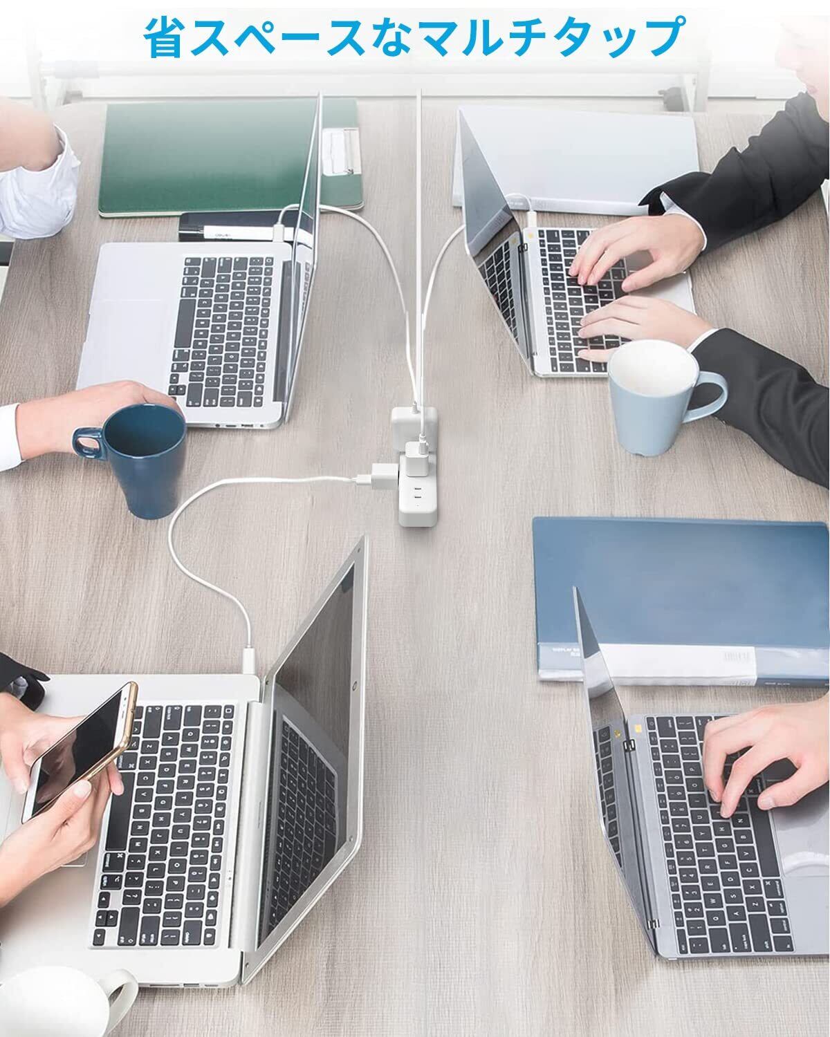 「テーブルタップ・壁掛けタップ」:電源タップの底に滑り止めが付いており、テーブルタップとしての使用感はさらに良くなります。また、底にはフック穴があり、壁等の場所にしっかり固定することができます。付属のマジックテープはコードをすっきり整理することができます。