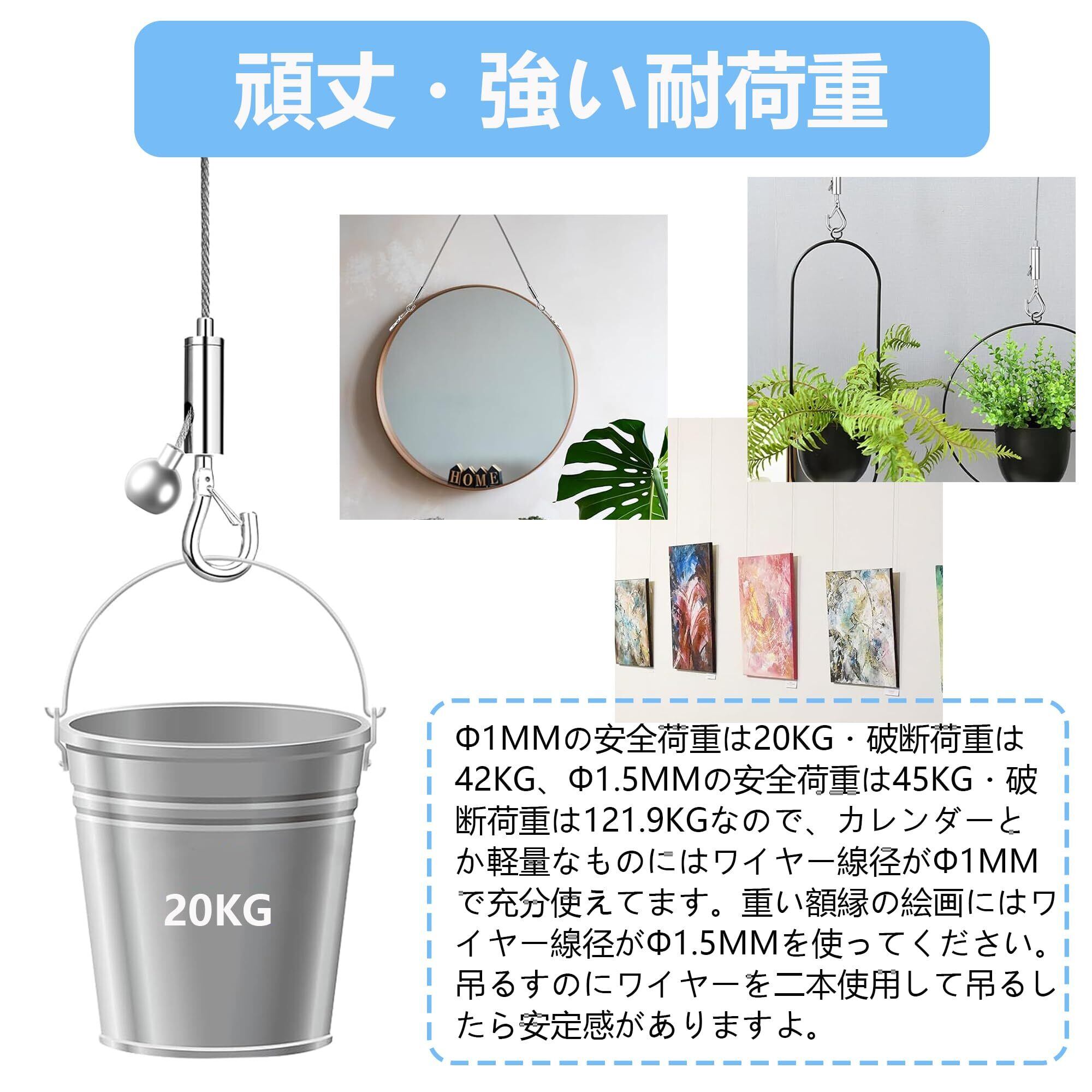 【安定した金具・高さワンタッチ調整】 ワイヤーが丈夫で金具も安定します、当社のフックは地震時にも落下しにくい特別な耐震構造を採用しています。【可動式の自在フック】ワンタッチで(フック上部の筒を押し下げる)作品の吊り下げ高さを自由に調整することができ、使い勝手が良い!さらに微妙な位置調整も簡単に行えます。初心者の方でも簡単に使えます。独特の小さなボールデザインにより、追加のステンレスフックを簡単に取り付けることができます、脱落防止のカラビナがついたフックタイプを採用します。フックの底部にある小さなボールが重い物が滑り落ちるのを効果的に防ぎ、アート作品が常に安全に固定されることを確保します。