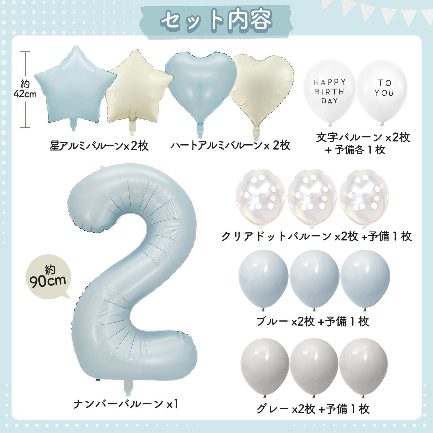 【豊富な23点セット】①くすみブルーナンバーバルーンx1(高さ90-100cm) ②ハートアルミバルーンx2「くすみブルー、くすみホワイト」 ③星アルミバルーンx2「くすみブルー、くすみホワイト」④グレー風船x3(2+予備1)⑤マカロンブルー風船x3(2+予備1)⑥クリアドット風船x3(2+予備1)⑦HAPPY BIRTHDAY白風船×2(大きさ約25cm) ⑧TO YOU白風船×2(大きさ約25cm) ⑨リボンx1「おまけ」⑩ドットシールx4枚「おまけ」※風船はペタンコの状態でお届けです。