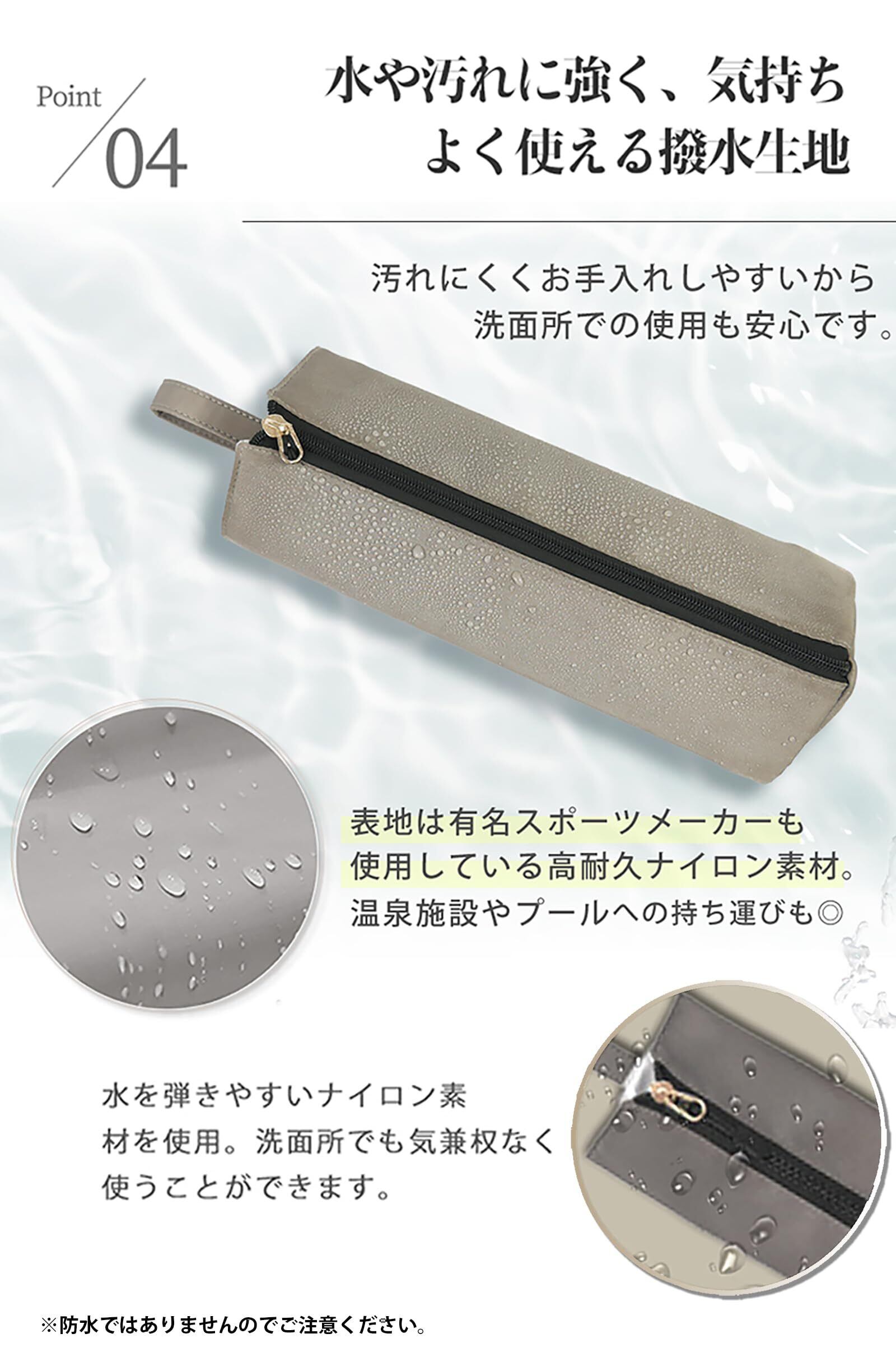 【水に強い生地】Agaouのヘアアイロンケースの表地は水や汚れに強い撥水・防水加工なので水や汚れに強く、気持ちよく使えます。有名スポーツも使用している高耐久ナイロン素材で、洗面周りでの使用でも汚れにくく、お手入れが簡単です。