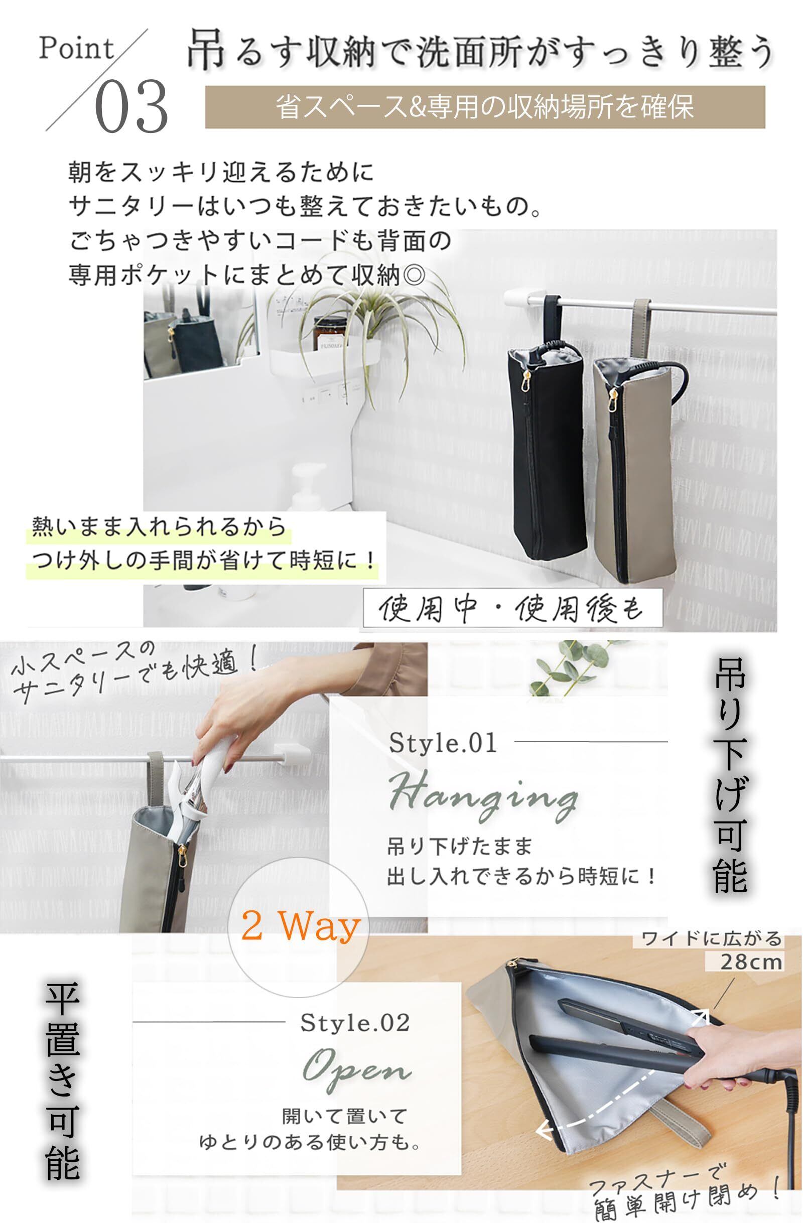 【 吊るして収納できる 】壁面のタオルハンガーや収納のワイヤーラック、洗濯機ラック(ランドリーラック)などに吊るしてお使いいただけます。ポーチながらも、アイロンホルダーのようにサッと取り出せる収納が可能です。洗面台に置きっぱなしにすることなく、ポーチでカバーして収納すれば、小さなお子さまが熱いアイロンに触れる心配もありません。