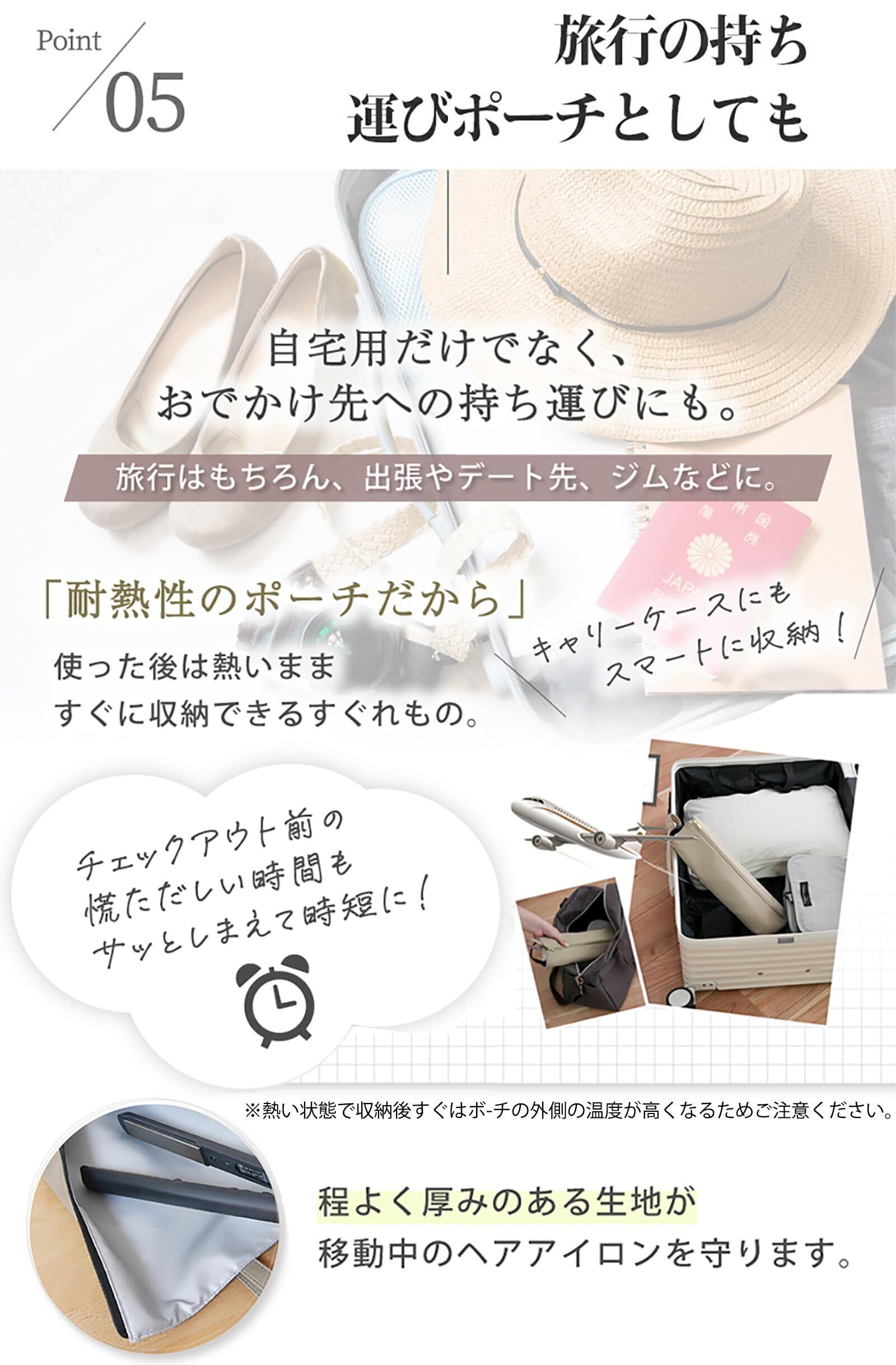 【 旅行中の持ち運びポーチとしても 】厚みのある生地がヘアアイロンを確実に保護し、旅行の持ち運びポーチとしても活躍します。熱に強い耐熱素材を使用しているため、アイロンをしまったままでも安心。チェックアウト前でもすぐにポーチに収納し、スーツケースに入れても安心です。