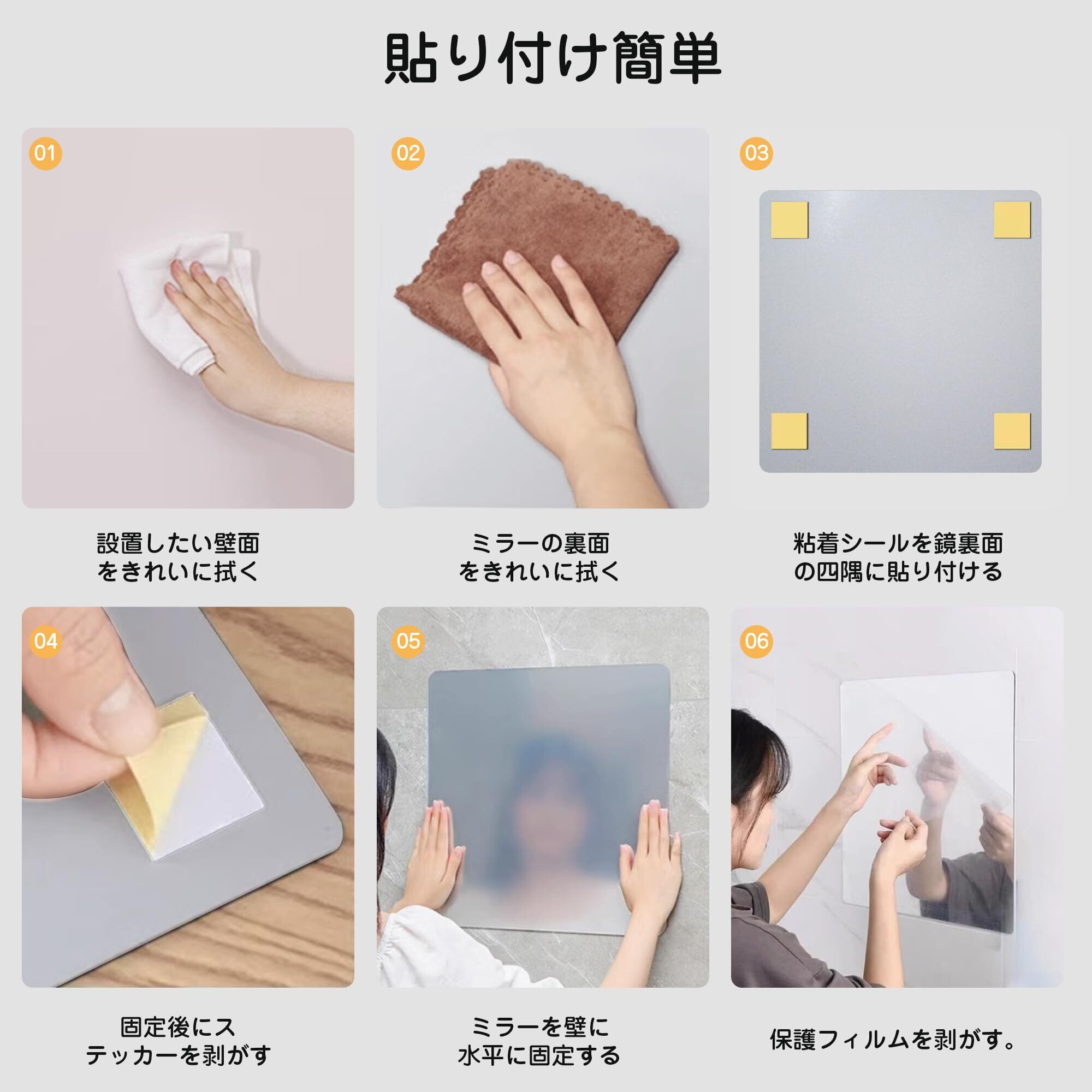 【簡単に取り付け可能】壁に直接貼り付けるタイプのミラーで、面倒なネジや工具は一切不要!裏面の強力な粘着テープを使用することで、誰でも簡単に取り付けができます。賃貸住宅でも安心して使用できます。