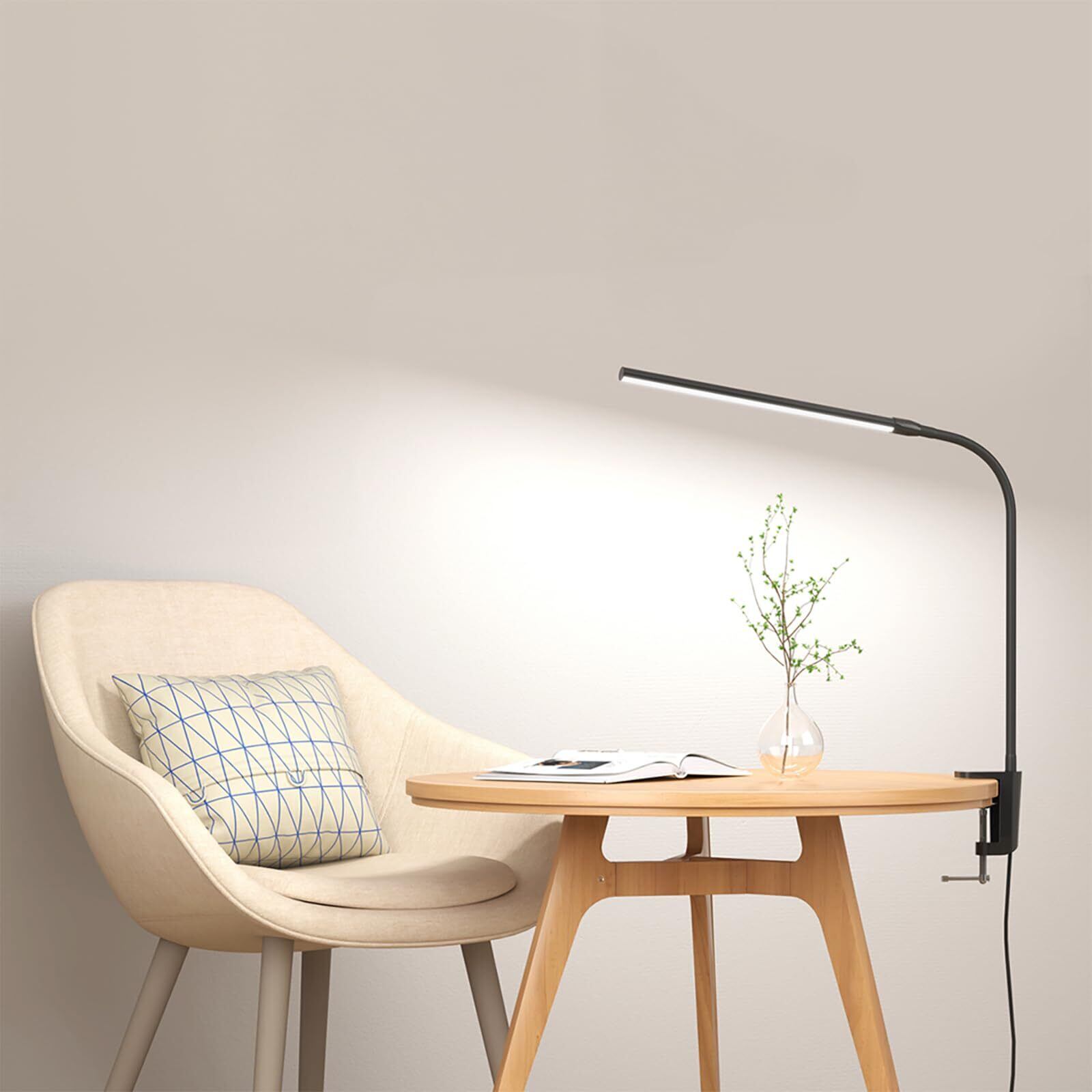 【しっかり挟める・省スペース】組み立ては非常に簡単で、工具は一切必要ありません。クランプを使うことで、厚さ5cmまでのテーブルにLEDデスクライトを簡単にかつしっかり固定することができます。クランプのデザインにより、デスクのスペースを大幅に節約できます。
