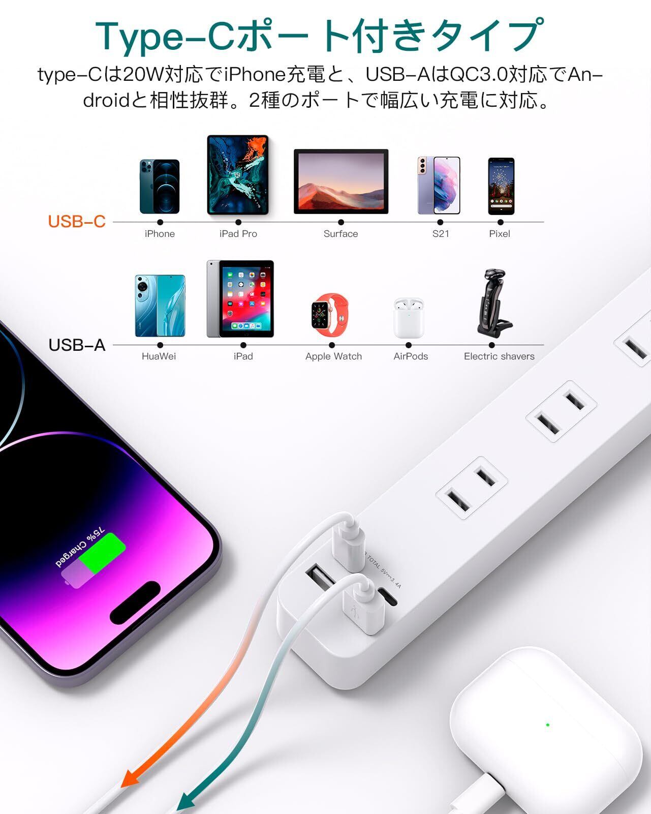 【10-in-1電源タップ&2Type-Cポート】電源タップ は新販売の携帯電話に対応するために2個typeCポートも特別に追加されており、typeCポートの充電ヘッドを購入する費用を節約できます。USBポート付だからアダプタ不要で、省スペースでスッキリにします。出張、会議室、自宅などで12台デバイスを充電できます。本製品は日本の電圧(100~125V)に合わせて設計されるので、日本国内、中国、米国または東南アジアでも使えます。定格を超えて使わないでください。(合計で 1400W 以下)